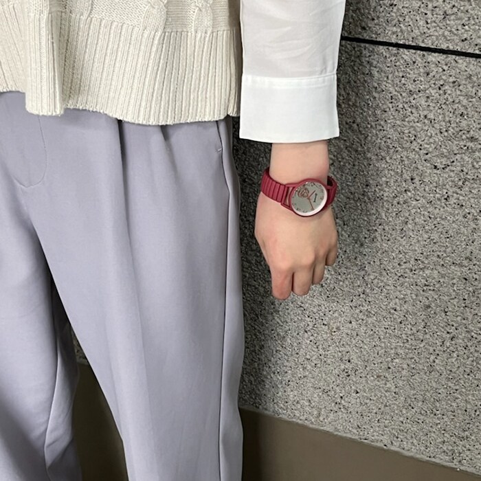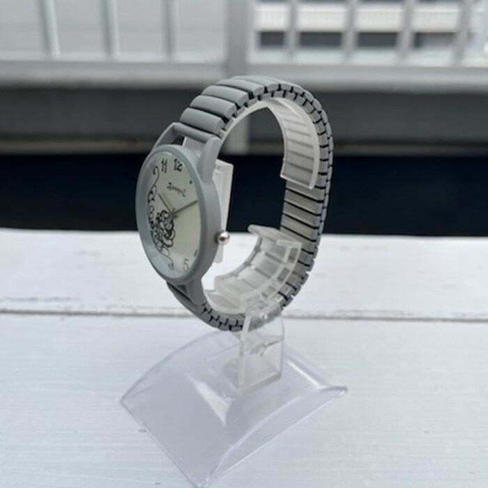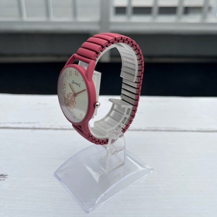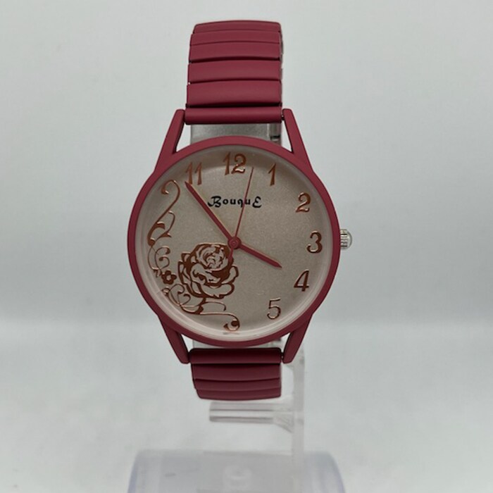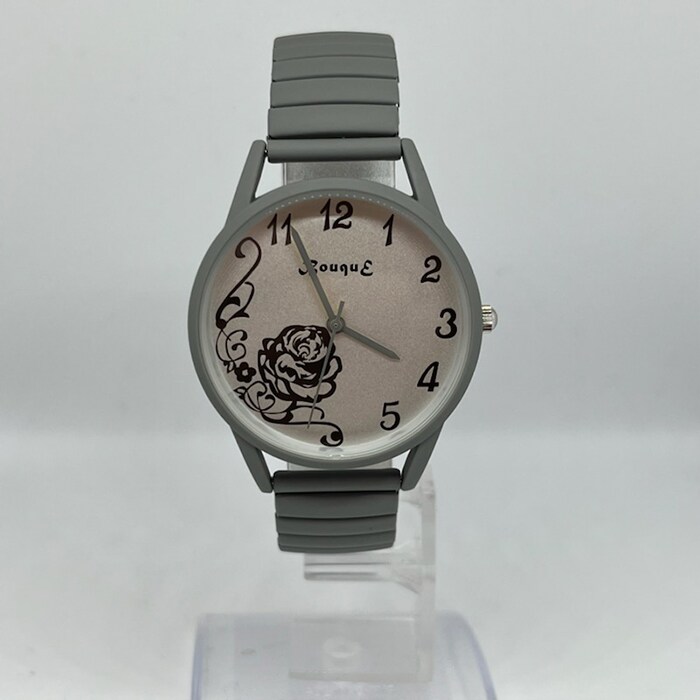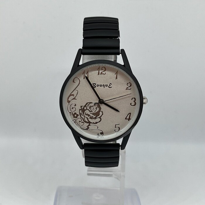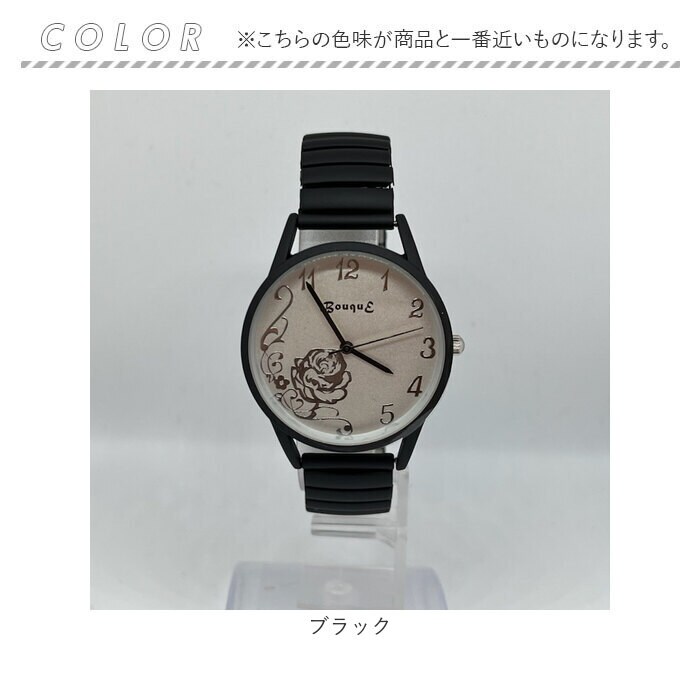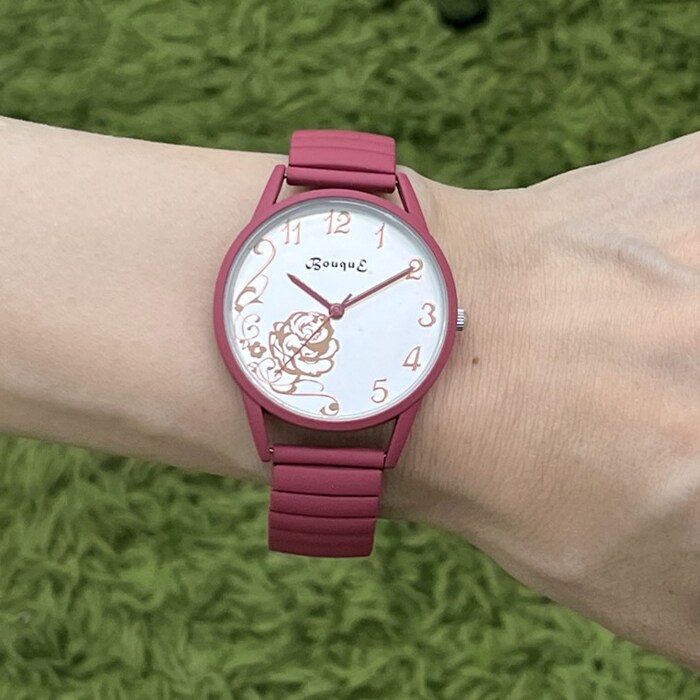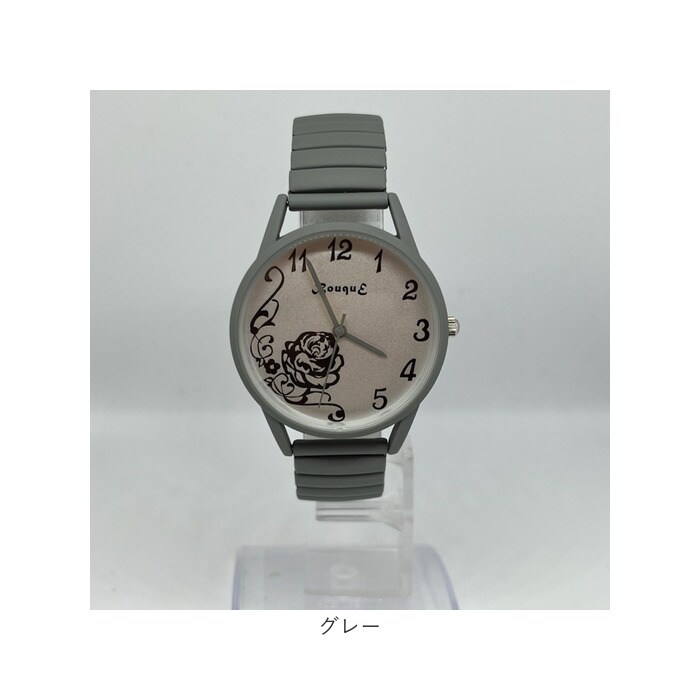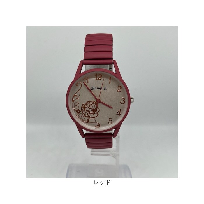 | 商品説明 | マットカラーで光沢をおさえて、文字盤のローズをより奇麗に見せる仕様。長針・時針・秒針も時計ケースカラーとマッチ。伸縮性のあるジャバラ時計でつけはずしも楽チン。 |