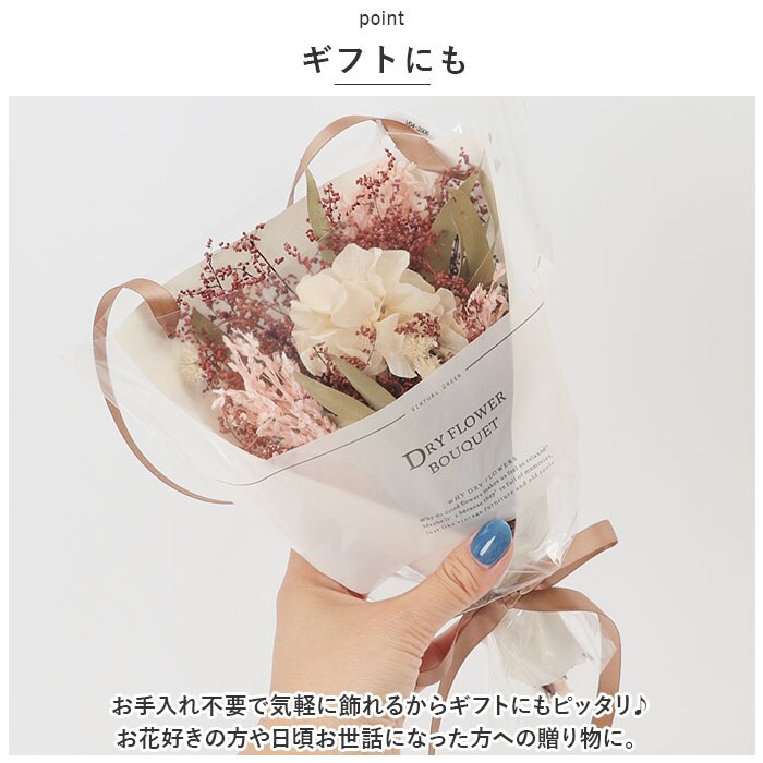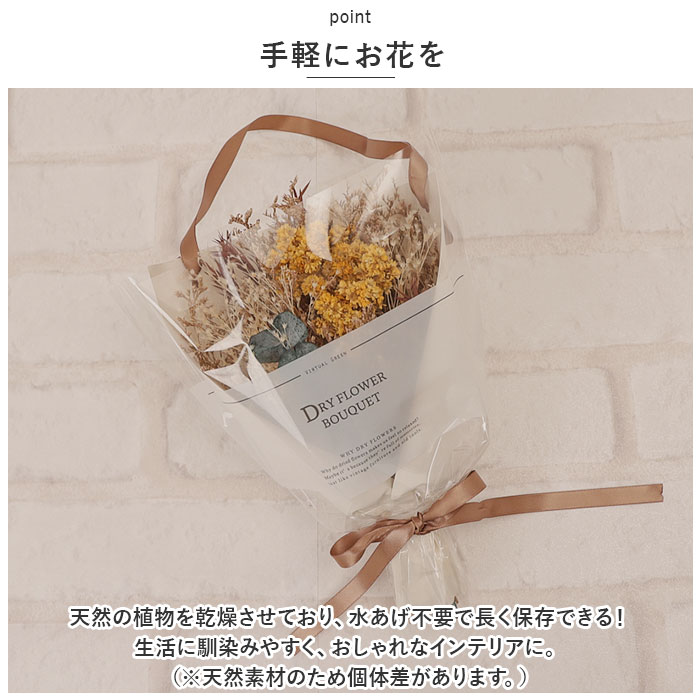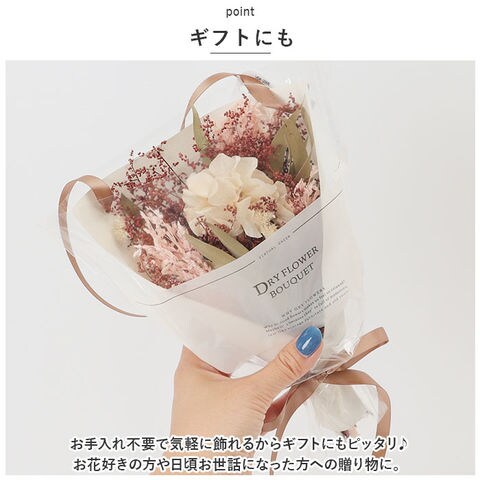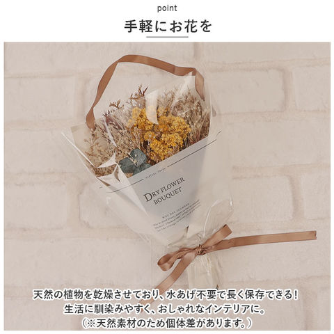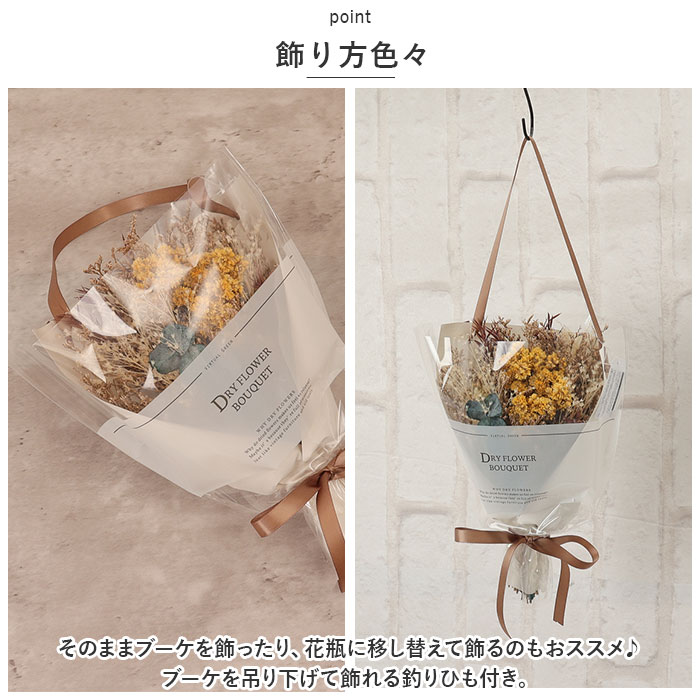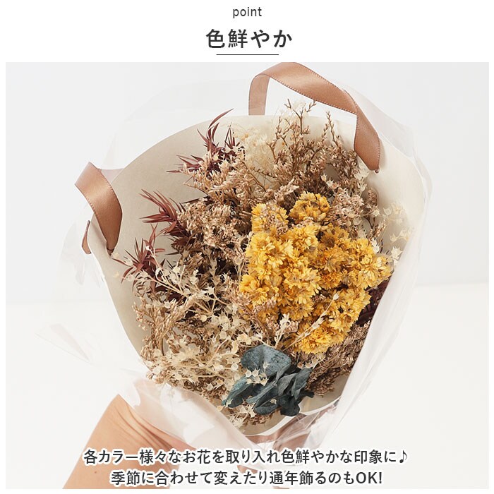 | 商品説明 | お花をより身近なインテリアに♪ドライフラワーブーケが新発売♪【手軽にお花を】天然の植物を乾燥させており、水あげ不要で長く保存できる!生活に馴染みやすく、おしゃれなインテリアに。(※天然素材のため個体差があります。)【色鮮やか】各カラー様々なお花を取り入れ色鮮やかな印象に♪季節に合わせて変えたり通年飾るのもOK!【飾り方色々】そのままブーケを飾ったり、花瓶に移し替えて飾るのもおススメ♪ブーケを吊り下げて飾れる釣りひも付き。【ギフトにも】お手入れ不要で気軽に飾れるからギフトにもピッタリ♪お花好きの方や日頃お世話になった方への贈り物に。 |