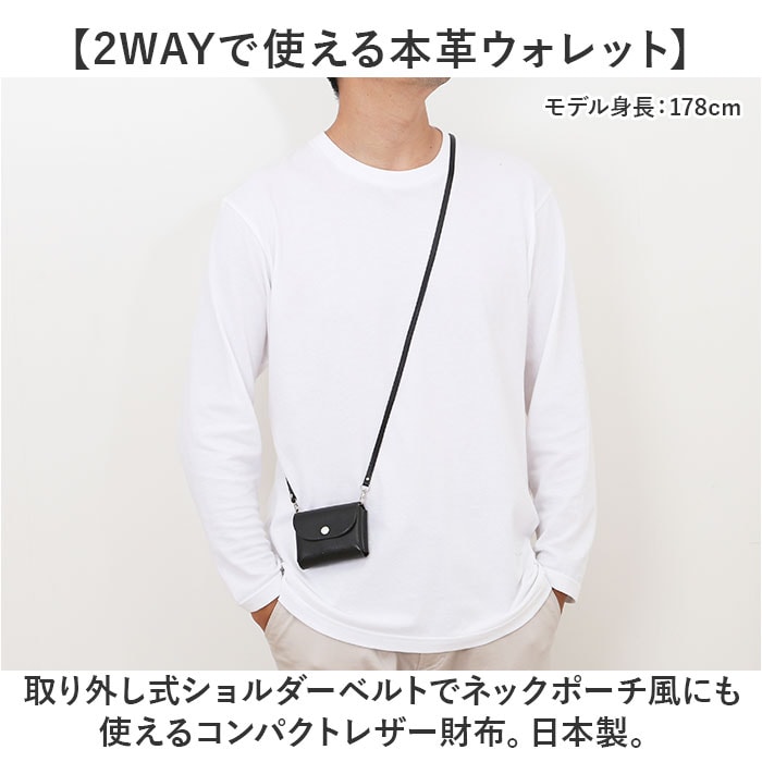 | 商品説明 | 【2WAYで使える本革ウォレット】取り外し式ショルダーベルトでネックポーチ風にも使えるコンパクトレザー財布。日本製。【経年変化を楽しめる本格レザー】植物性タンニン鞣しの牛革に、オイルシュリンク加工を施した艶感、質感が魅力。【簡単開閉】スナップボタン式で取り出しやすい◎【コンパクトに分類収納】マチもあるのでお札・コイン・カードをスマートに整理できる!【便利設計】お札はスルスルっと差し込めばそのまま収納可能♪ |