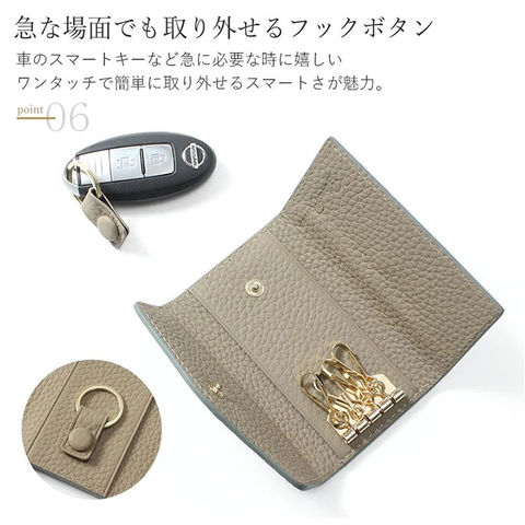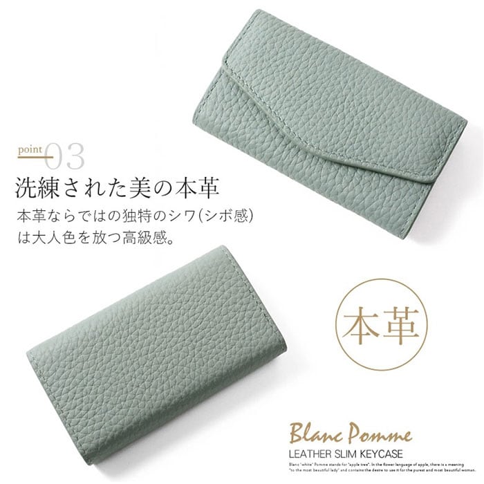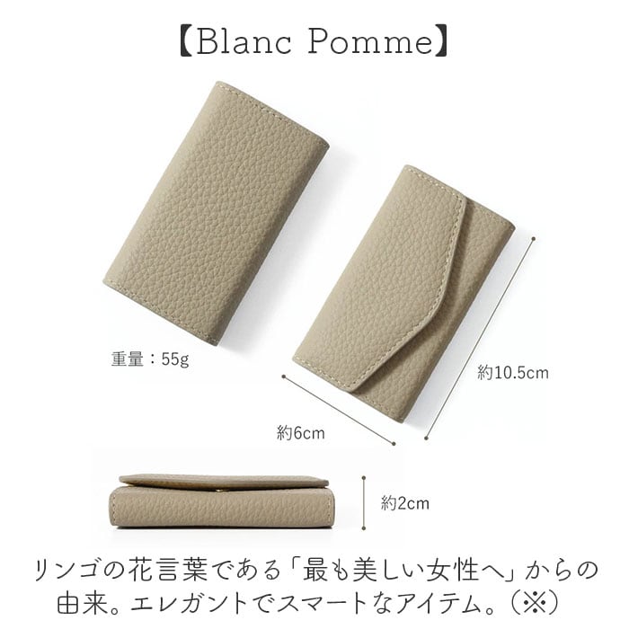| 商品説明 | 【ミニマルで使いやすい】装飾が少ないミニマルデザインでスマートに使える☆4連キーケースが発売!【洗練されたシンプルさ】装飾がないシンプルさがポイント。無地のバイカラーで洗練されたデザイン♪【嬉しい本革製】耐久性もある本革を採用。独特なシボ感もあり高級感ある仕上がり。【機能性抜群】・4つのキーフックの他、大きな鍵や家や車のスマートキーの取り付けに最適なキーリング付き。【キーリングは取り外しOK】キーリングはスナップボタンで簡単に付け外しができるのもポイント。【ポケットやミニバッグにIN】コンパクトで薄型の作りなので、アウターなどのポケットやミニバッグに収納OK。【Blanc Pomme】リンゴの花言葉である「最も美しい女性へ」からの由来。エレガントでスマートなアイテム。(※)Blancは「白い」、Pomme は「リンゴの木」をを意味する言葉です。【機能仕様】キーフック×4、キーリング×1 |