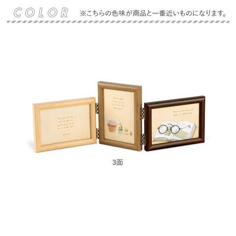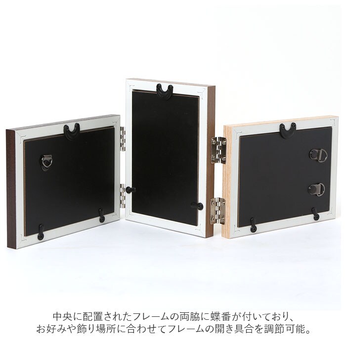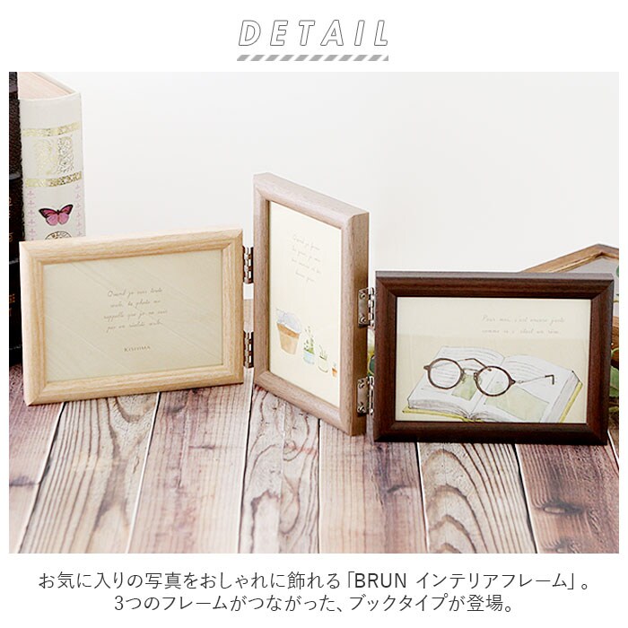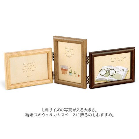 | 商品説明 | お気に入りの写真をおしゃれに飾れる「BRUN インテリアフレーム」。3つのフレームがつながった、ブックタイプが登場。温かみのある3カラーの木目調フレーム。どんな写真にも合わせやすい、シンプルなデザインが魅力◎L判サイズの写真が入る大きさ。中央に配置されたフレームの両脇に蝶番が付いており、お好みや飾り場所に合わせてフレームの開き具合を調節可能。卓上に置くのはもちろん、背面の金具を使って縦横どちらの向きでも壁掛けOK!結婚式のウェルカムスペースに飾るのもおすすめ。 |