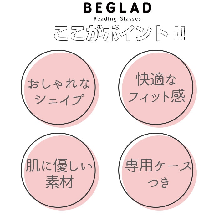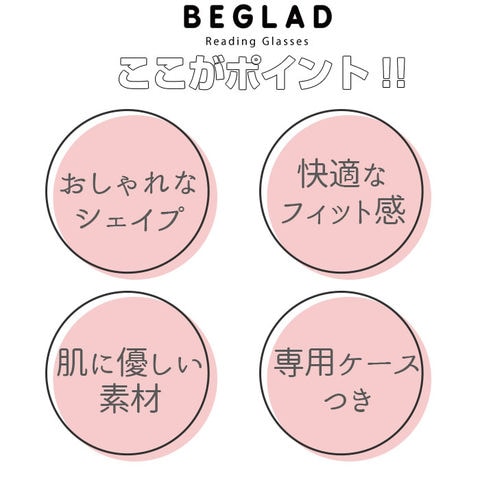 | 注意点 | 本品の使用中に不快を感じた場合は、すぐに使用を止めてください。レンズを下に向けて置かないで下さい。レンズにキズが付くおそれがあります。保管、持ち運びの際は、必ずケースに入れてください。破損のおそれがあります。アルカリ洗剤等で洗わないでください。劣化のおそれがあります。ケースの一部に磁石を使用しており、磁気ストライプを使用したカードを近づけないでください。使用できなくなる恐れがあります。高温になる場所(車内や暖房器具の前など)、直射日光のあたる場所(レンズを通して日光が発火するおそれがあります。)、及び高温多湿の場所に置かないでください。破損のおそれがあります。本品は手元用の眼鏡です。本品を装着したまま、歩行、運転等をしないでください。金属アレルギーのある方は、金属製フレームの本品のご使用前にご注意ください。カメラやモニターの性質により、画像と実物の色の違いがある場合がございますのでご理解願います。 |