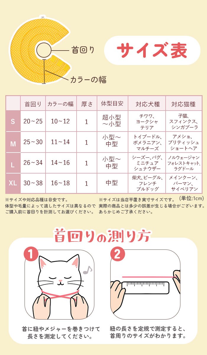 | サイズ | [ペット用エリザベスカラー] ・Sサイズ ・Mサイズ ・Lサイズ ・XLサイズ ※サイズについて詳細は、サイズ表をご覧くださいませ。 |