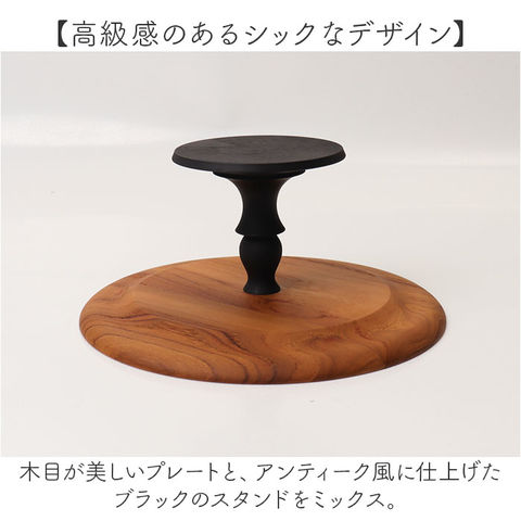 | 商品説明 | 【いつものお料理に特別感を♪】ケーキやお菓子がキレイに映える!「Cake stand bicolor round」。【高級感のあるシックなデザイン】木目が美しいプレートと、アンティーク風に仕上げたブラックのスタンドをミックス。【使うほどに愛着のわくアイテム】温かみがあり、優しい風合いの木製スタンド。経年変化を楽しめるのも魅力の1つ。【自宅で気軽にカフェ気分】ちょっとしたオードブルやスイーツを乗せて、カフェのアフタヌーンティーを再現♪【収納に困らないセパレートタイプ】スタンドを簡単に取り外せて、収納が1/3に!スペースの限られた食器棚にもすっぽり。【プレート単体でもお好みで】スタンドなしでプレートとしても活用OK。使い方をアレンジできるのが嬉しい!【コーティングで傷などをガード】プレート表面に塗膜を作るウレタン仕上げ。傷つきから守り、素材の美しさをキープ◎【小物をおしゃれにディスプレイ】時計やアクセサリーなど、お気に入りのアイテムを置くだけで見せる収納に。【イベントなどで大活躍間違いなし】小さなホールケーキが乗るくらいのサイズ感。お誕生日会やホームパーティーにもおすすめ! |