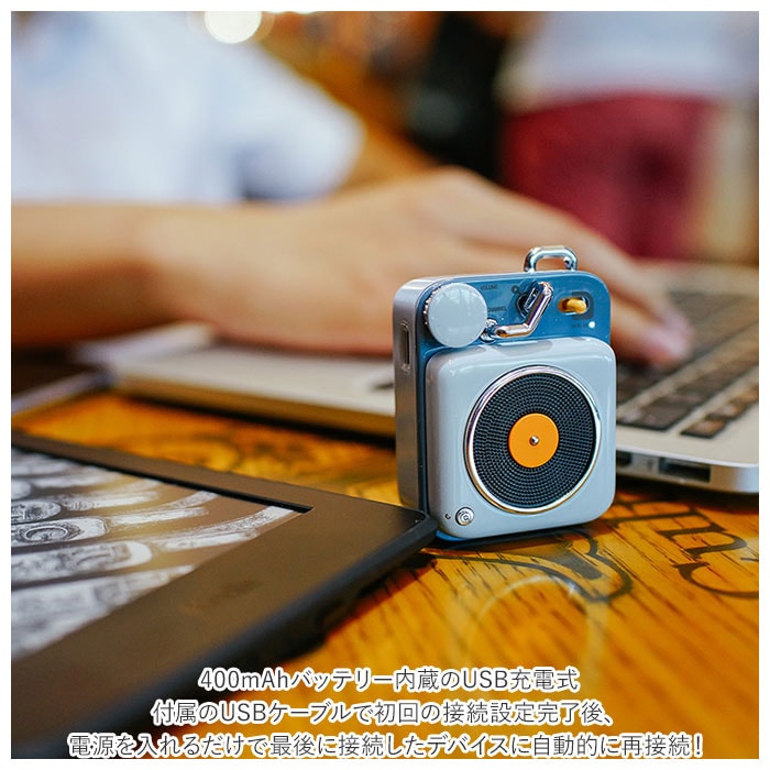 | 商品説明 | レトロポップなデザインが可愛い、超小型タイプの「Button ブルートゥーススピーカー」が登場。手のひらに収まるコンパクトサイズながら、パワフルで高音質、クリアなサウンドを楽しめるBluetooth対応スピーカー。・400mAhバッテリー内蔵のUSB充電式。付属のUSBケーブルで初回の接続設定完了後、電源を入れるだけで最後に接続したデバイスに自動的に再接続!再生可能時間は最大音量で約4時間、50%の音量で約8時間。(※使用環境により異なります。)ボリュームダイヤル、曲送りレバー、電源レバー付きで、レコードプレイヤーのような、どこか懐かしいデザイン。付属のストラップで、カバンなどへ取り付けOK。いつでもどこでも自由に音楽を楽しめるアイテム!オリジナルシールが付属。可愛い化粧箱入り&紙バッグ付きで、プレゼントに最適。 |
