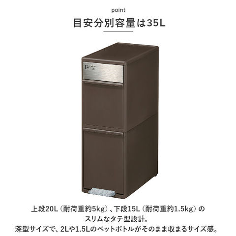 | 商品説明 | 資源ゴミを収納する分別ストッカー「like-it 分別スイングステーション2段 」ステンレスタイプが新登場。【お部屋に馴染みやすい♪】シンプルでスタイリッシュなデザイン。【目安分別容量は35L】上段20L(耐荷重約5kg)、下段15L(耐荷重約1.5kg)のスリムなタテ型設計。【お手入れラクチン】汚れが気になったらサッと拭き取り!上段・下段ともに取り外し可能。【ゴミの分別に!】おしゃれな区分シールが付属。さらに細かく分類できるチェックボックス付き。《上段スイングユニット》【インテリア性アップ】シックなステンレス製スイングパネルを装備。片手で廃棄物を押し込んで投入。【多分別OKな引き出し】引き出し内の切り込みに袋を引っ掛けるだけ。1段で数種類の分別ができちゃう!《下段ペダルユニット》【フットペダル開閉式】かがむことなくゴミ捨てラクラク!【深型サイズ】・2Lや1.5Lのペットボトルがそのまま収まるサイズ感。 |