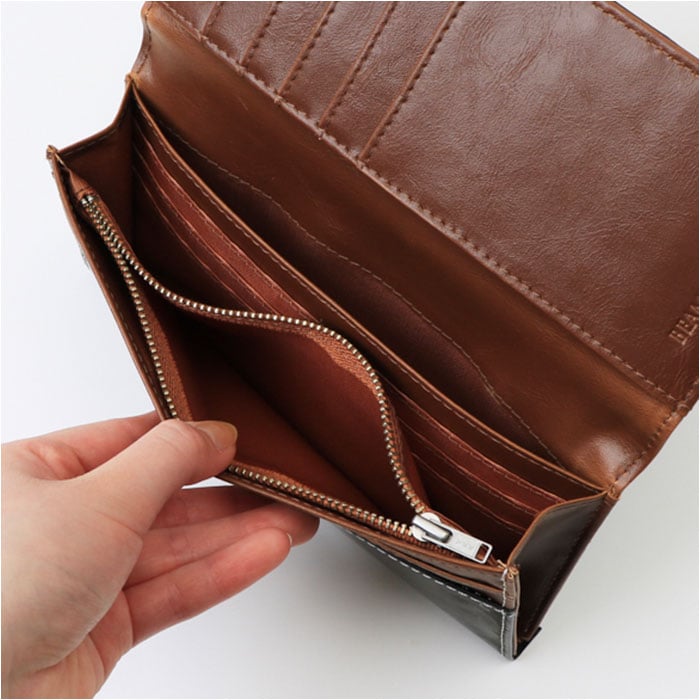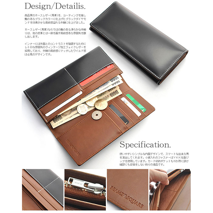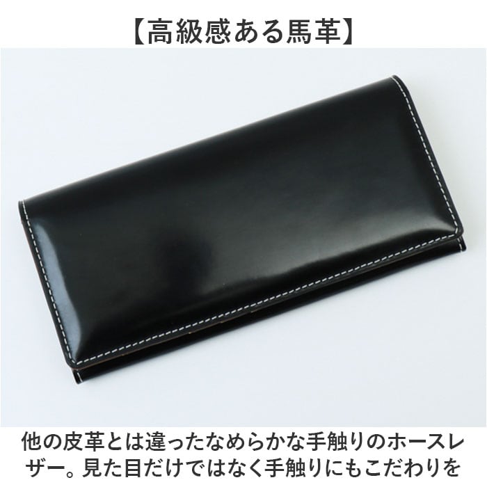 | 商品説明 | 【ブラックダイヤモンドのような輝き】レザーをブラックカラーに、染め上げダイヤモンドのような艶ときらめきをプラス。【高級感ある馬革】他の皮革とは違ったなめらかな手触りのホースレザー。見た目だけではなく手触りにもこだわりを【ワイルドさもプラス】インナーにはレトロな雰囲気のあるフェイクレザー。外見の高級感にマッチしたワイルドさ。【収納充実な長財布】お札や領収書がそのまま入る長財布タイプ。カードポケットも充実。【カバンの中でかさばらず】薄マチの構造でカバンの中でもかさばらないのも嬉しいポイント。【スムーズなフラップ仕様】メインの開口部は留め具がなく開け閉めがしやすいフラップ。お会計がスマートに。【YKKファスナー採用】小銭入れのファスナーは、開閉時の突っかかりが少ないようYKKファスナーを採用。【贈答用に】しっかりとしたこだわりのある作りと、化粧箱入りでギフトにもピッタリなアイテム。【ポケット仕様】カードポケット×15、お札入れ×1、フリーポケット×2、小銭入れ×1 |