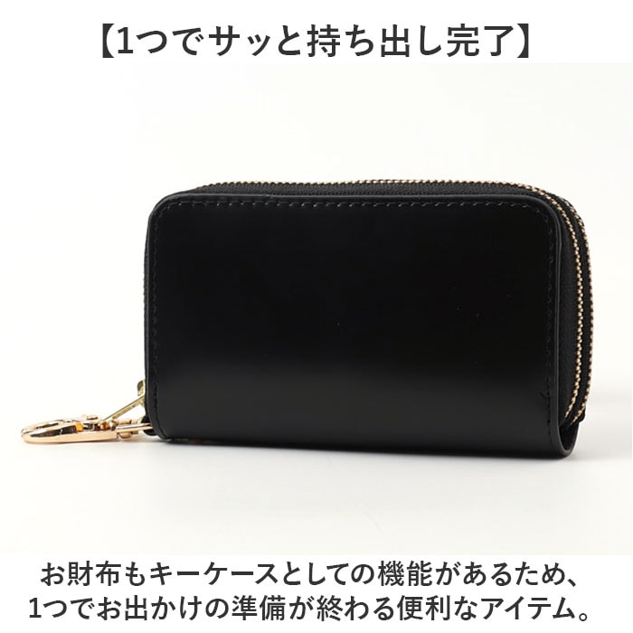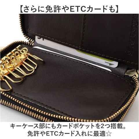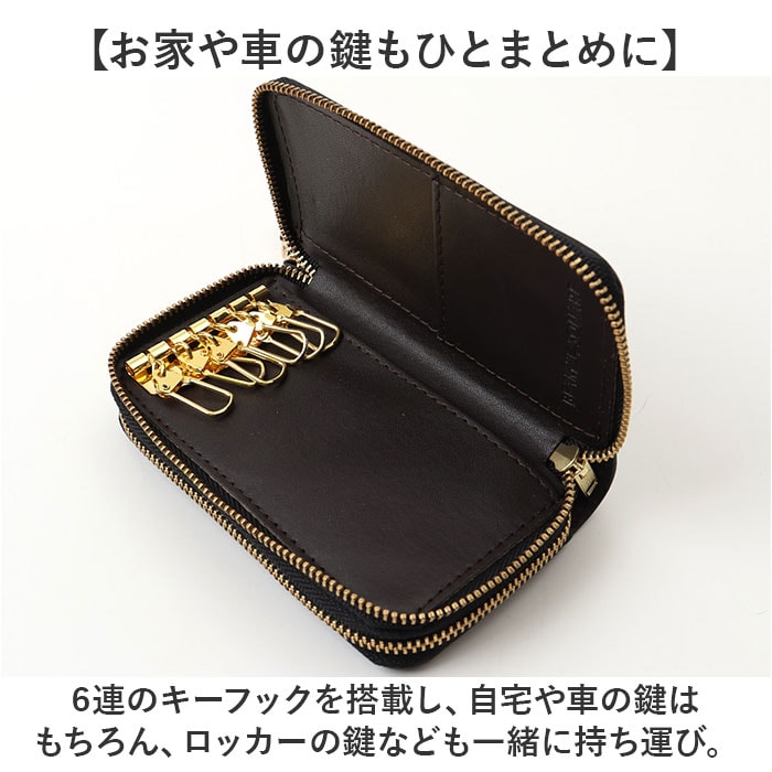 | 商品説明 | 【スタイリッシュな見た目が◎】スタイリッシュでメンズに嬉しい♪オールブラックの馬革マルチキーウォレットが登場。【大人男子のマストアイテム】ブラックに輝く本革とゴールドファスナーの組み合わせが落ち着いた大人男子を演出。【お家や車の鍵もひとまとめに】・6連のキーフックを搭載し、自宅や車の鍵はもちろん、ロッカーの鍵なども一緒に持ち運び。【小銭など少量の現金をIN】背面のファスナーポケットには小銭を入れたり、クレカなどの収納に便利なポケット付き【さらに免許やETCカードも】キーケース部にもカードポケットを2つ搭載。免許やETCカード入れに最適☆【細めの小物が入るポケットも】駐車券など細めの小物が入るポケット付き。【1つでサッと持ち出し完了】お財布もキーケースとしての機能があるため、1つでお出かけの準備が終わる便利なアイテム。【ベルトループに引っ掛けOK】ナスカンでベルトループに引っ掛けてハンズフリーで携帯できる♪落下や紛失予防もバッチリ。【カードやお札が取り出しやすい】開口部はラウンドファスナー構造で収納した小物の取り出しがスムーズに。【引っ掛かり少ないファスナー】・開口部は2つともYKK社製のファスナーを採用し、引っ掛かり少なく開閉可能【自分用はもちろんギフトにも】ブランドロゴ付きの化粧箱入りなので、大切な方へのギフトにもピッタリ☆【ポケット仕様】・フロント・・・キーフック×6、カードポケット×2、オープンポケット×1・背面・・・フリーポケット×1、小銭入れ×1(2ルーム仕様) |