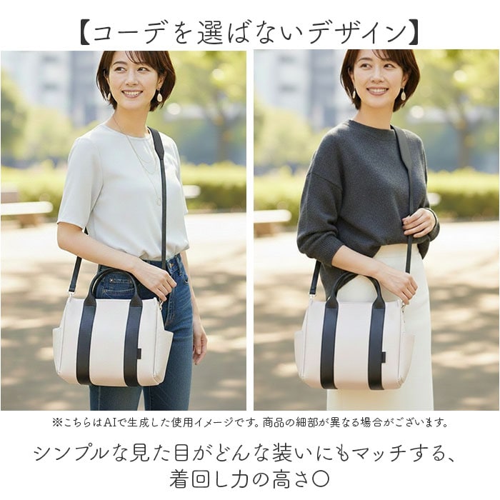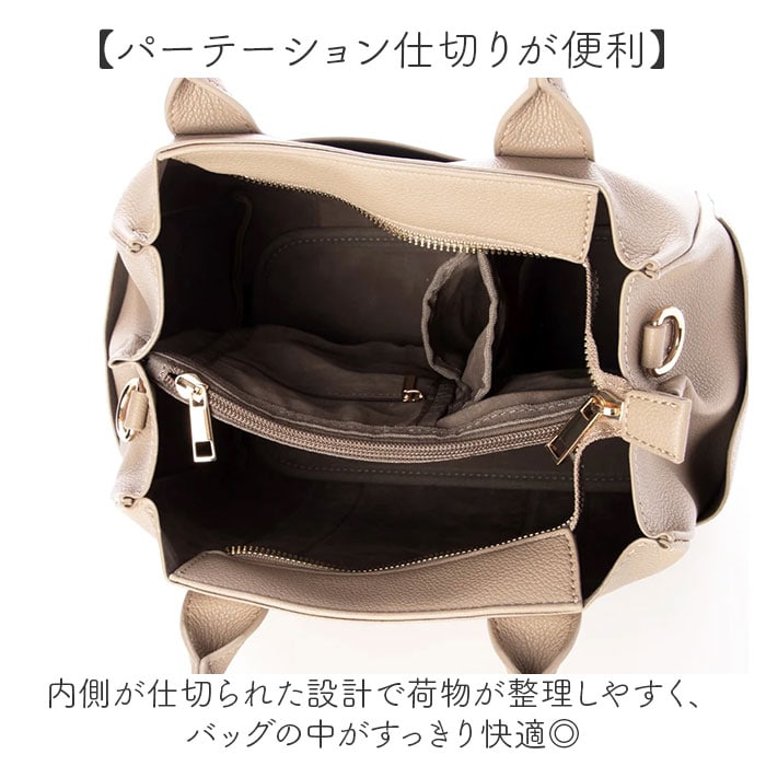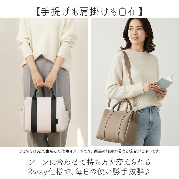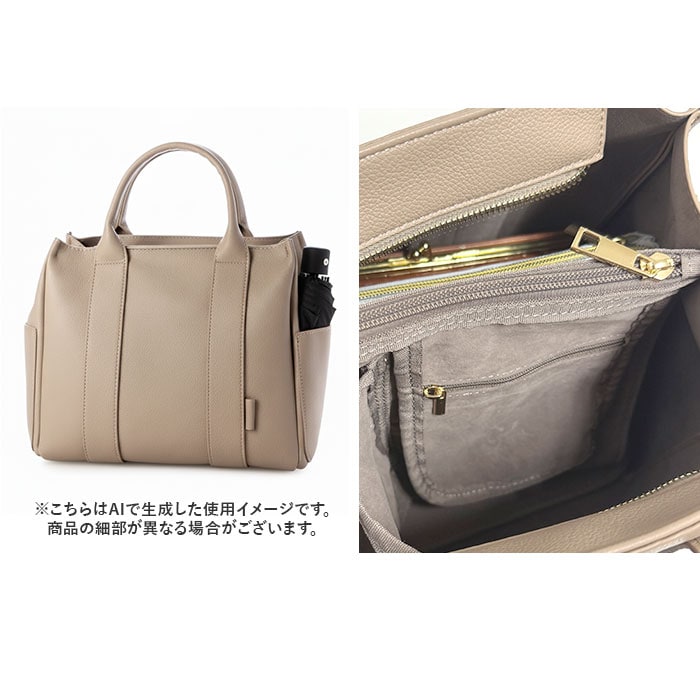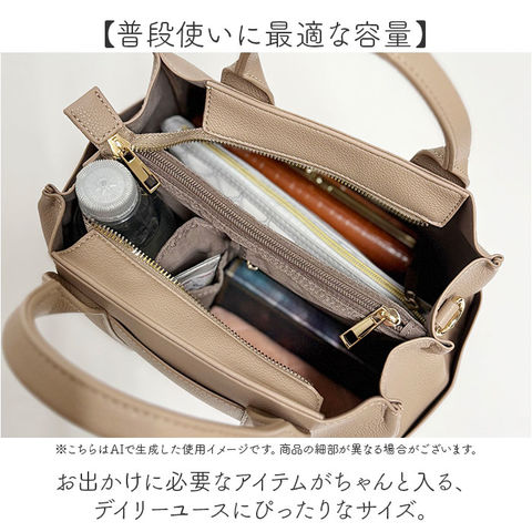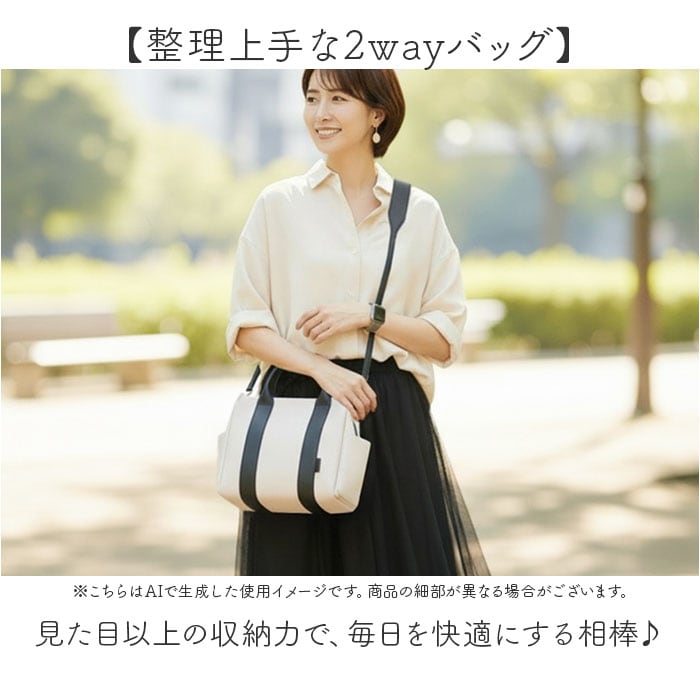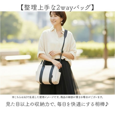 | 商品説明 | 【整理上手な2wayバッグ】見た目以上の収納力で、毎日を快適にする相棒♪【手提げも肩掛けも自在】シーンに合わせて持ち方を変えられる2way仕様で、毎日の使い勝手抜群♪【パーテーション仕切りが便利】内側が仕切られた設計で荷物が整理しやすく、バッグの中がすっきり快適◎【普段使いに最適な容量】お出かけに必要なアイテムがちゃんと入る、デイリーユースにぴったりなサイズ。【コーデを選ばないデザイン】シンプルな見た目がどんな装いにもマッチする、着回し力の高さ〇 |