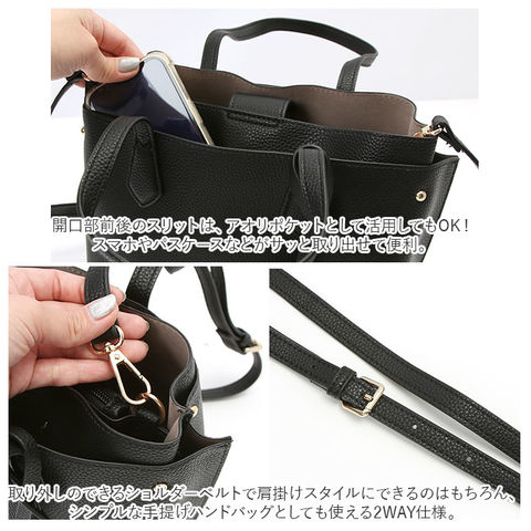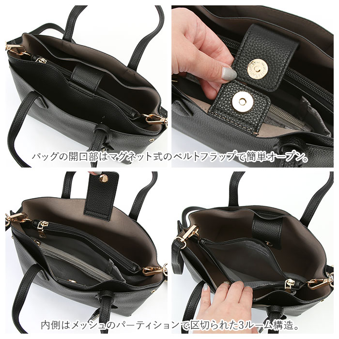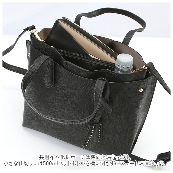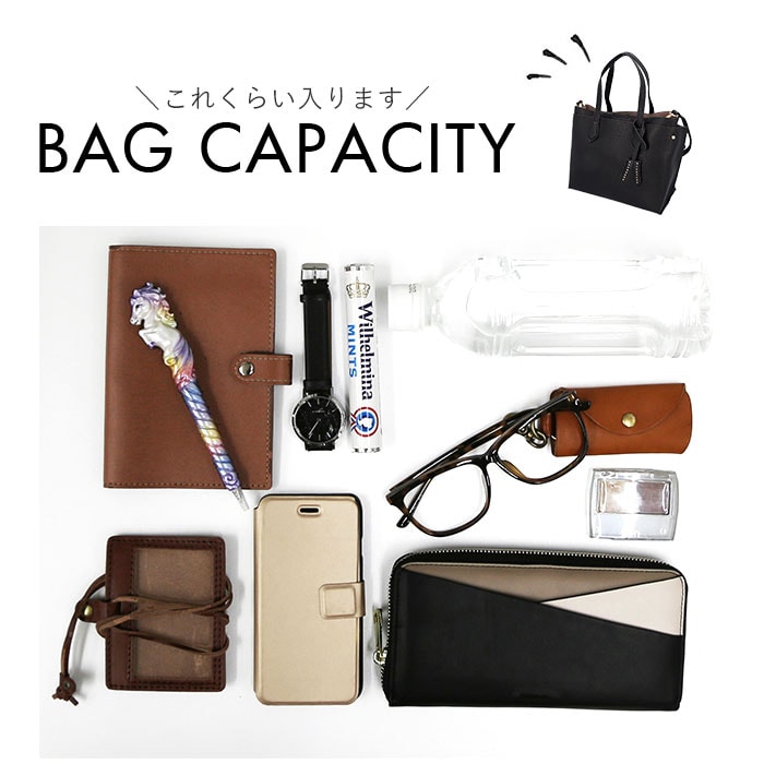 | 商品説明 | ・「cache cache -カシュカシュ-」とは、フランス語で「かくれんぼ」の意。日常をさりげなく彩る、ガーリッシュでちょっと大人っぽさをミックスしたファッション小物が魅力のブランド。色味や風合いの異なるフェイクレザーを2枚重ね合わせて仕上げた、エレガントな雰囲気が楽しめる2WAYパーティショントート。バッグの開口部はマグネット式のベルトフラップで簡単オープン。外出先でのプライバシーを程よく確保しながら、小物の取り出しがスムーズ。内側はメッシュのパーティションで区切られた3ルーム構造で、小物が整然と収納できて迷子にならない機能的なつくり。長財布や化粧ポーチは横向きにすっぽり。小さな仕切りには500mlペットボトルを横に倒さずにスマートに収納可能。中央の仕切り部分は、細々した小物をすっきりと整理できるファスナーポケット仕様。中が透けて見えるメッシュ生地なので、しまった物がひと目で確認できるのが嬉しいポイント。開口部前後のスリットは、アオリポケットとしても活用してもOK!スマホやパスケースなど出番の多い小物がサッと取り出せて便利。トートの中にぴったり収まる、メッシュ生地のミニポーチが付属。内側にアトマイザーや化粧水のミニボトルを小分けにできるポケット付き。取り外しのできるショルダーベルトで肩掛けスタイルにできるのはもちろん、シンプルな手提げハンドバッグとしても使える2WAY仕様。ゴールドの小さなカシメがキラリと光る、ハンドルに絡めたキーチャームがワンポイント。キーリングはマルカンフックになっているため、鍵はワンタッチで付け外しできる仕組み。大人カジュアルを華やかに引き立てるバイカラー、フォーマルにも馴染む「ブラック」「キャメル」などのワンカラーまで、自分のスタイルに合わせて選べるカラーバリエーション。 |