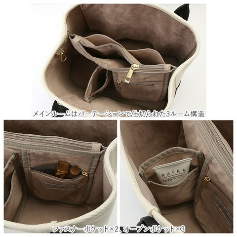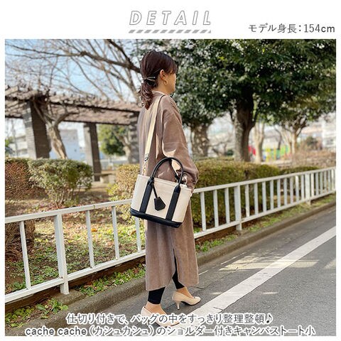 | 商品説明 | 仕切り付きで、バッグの中をすっきり整理整頓♪cache cache(カシュカシュ)のショルダー付きキャンバストート小。・「cache cache」とは、フランス語で「かくれんぼ」の意。ガーリッシュと大人っぽさをミックスした、デイリーカジュアルなファッション小物を展開。オールシーズン使える、ナチュラルなキャンバス生地を使用。ハンドルや底面などにフェイクレザー素材をプラスし、デザインのアクセントに♪メインルームはパーテーションで仕切られた3ルーム構造。荷物の定位置を決めやすく、小物が迷子になりにくいつくり。(※パーテーションの底部は縫い付けられておりません。)幅広のスペースはA5サイズ対応。長財布も横向きにすっぽり収まるサイズ感。・500mlペットボトルは立てて収納可能。(※立てた場合、上部が少し飛び出します。)ファスナーポケット×2、オープンポケット×3は、細々とした物の収納に便利。内側の生地は高級感のあるスエード調。目隠し用のフラップでトートの開口部を覆えるから、プライバシー面も安心。開口部には鍵などを取り付けできるフック付き。フロントのオープンポケットには、サッと取り出したい小物をIN。取り外し可能な底板付きで、テーブルや床に置いた状態でもしっかり自立。ランチボックスも安定した状態で持ち運びできちゃう!底面4ヵ所に底鋲が打ち込まれており、直置きするときに生地が汚れにくいのも嬉しい◎手持ちではもちろん、長さ調節可能なショルダーベルトを取り付けて肩掛けや斜め掛けもOK。(※ショルダーベルトは、持ち手の後ろに配置された金具に取り付け。)取り外しできるフェイクレザーチャーム付き。 |