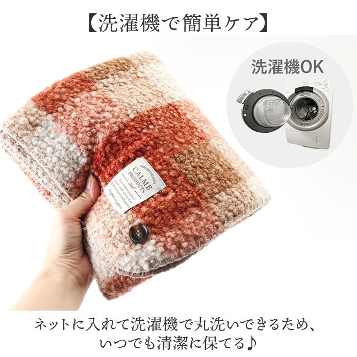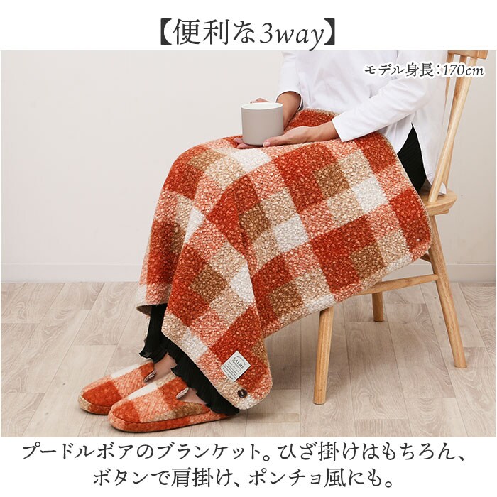 | 商品説明 | 【便利な3way】プードルボアのブランケット。ひざ掛けはもちろん、ボタンで肩掛け、ポンチョ風にも。【ふんわりあたたかな触り心地】表面のくるくるとしたプードルボアと内側のふわふわの毛足の長いボアがリラックスタイムを演出◎【洗濯機で簡単ケア】ネットに入れて洗濯機で丸洗いできるため、いつでも清潔に保てる♪【ギフトにも最適】大切な方へのプレゼントにも♪ |