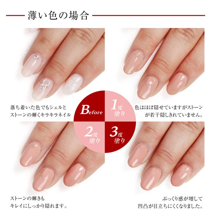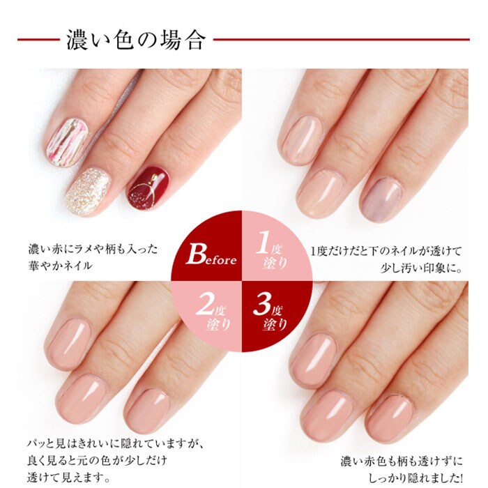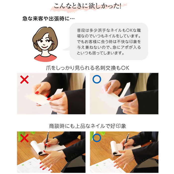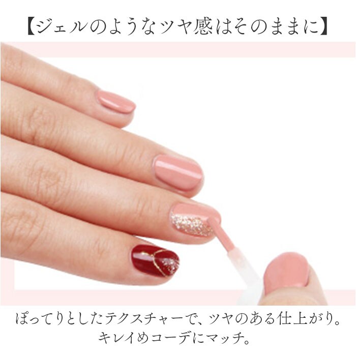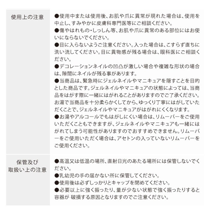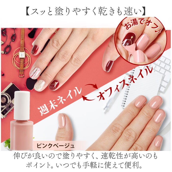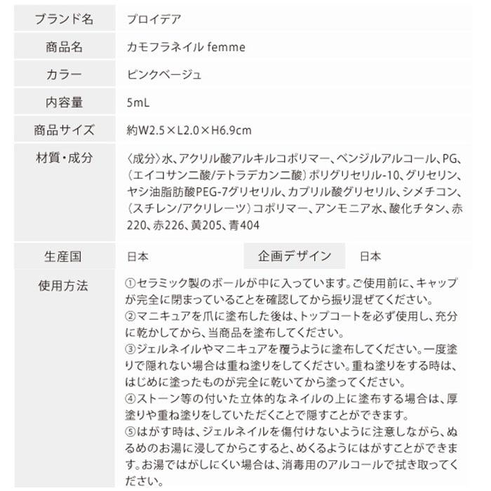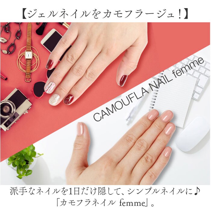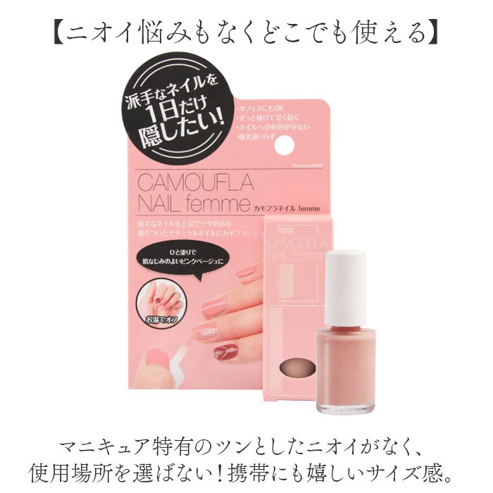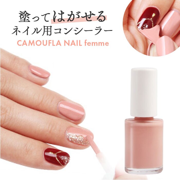 | 商品説明 | 【ジェルネイルをカモフラージュ!】派手なネイルを1日だけ隠して、シンプルネイルに♪「カモフラネイル femme」。【突然の予定にも慌てず対応できる】急な出張やお子さまの行事、突然の不幸など…。必要な時だけ、ネイルをサッと隠せる!【重ねて塗るだけで上品ネイルに変身】ジェルネイルやネイルアートの上にひと塗り。肌なじみが良く、大人可愛いピンクベージュに♪(※1)ひと塗りで隠れない場合は、完全に乾いてから重ね塗りしてください。【ジェルのようなツヤ感はそのままに】ぽってりとしたテクスチャーで、ツヤのある仕上がり。キレイめコーデにマッチ。【爪に優しいウォーターベース】ネイルへの負担が少なく、どなたでも安心して使えるネイルコンシーラー。立体アートもカバー!(※2)ストーンなどが付いた立体ネイルの上に塗布する際は、厚塗りや重ね塗りすることで目立ちにくくなります。大きめのストーンの凹凸は隠しきれませんが、輝きは隠すことが可能です。【スッと塗りやすく乾きも速い】伸びが良いので塗りやすく、速乾性が高いのもポイント。いつでも手軽に使えて便利。【ニオイ悩みもなくどこでも使える】マニキュア特有のツンとしたニオイがなく、使用場所を選ばない!携帯にも嬉しいサイズ感。【ジェルネイルの傷みもカバー】ジェルネイルの気になる傷みを隠したい時にもおすすめ。お直しに行く時間が取れない時に重宝。【除光液いらず◎お湯で簡単オフ】ぬるめのお湯に浸すと、薄い膜がペロンと取れるように剥がせる!細かい部分はアルコールで。(※3)お湯で剥がしにくい場合や細かいスキマは、消毒用アルコールを染み込ませたコットンで拭き取ってください。【可愛いネイルを気軽に楽しもう】爪のおしゃれを我慢せず、元のネイルを傷つけずに隠せる1DAYアイテム。安心安全な日本製。 |