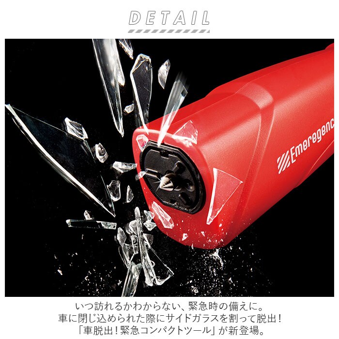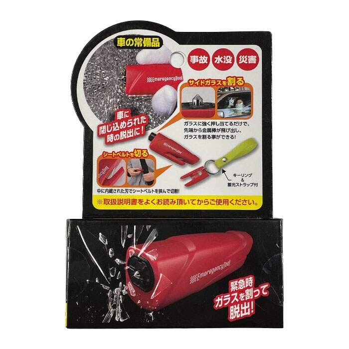 | 商品説明 | いつ訪れるかわからない、緊急時の備えに。車に閉じ込められた際にサイドガラスを割って脱出!「車脱出!緊急コンパクトツール」が新登場。車事故や災害、水没…いざという時に便利な、自分や大切な人の身を守るためのアイテム。車に閉じ込められた際、ガラスに強く押し当てると先端から金属棒が飛び出し、サイドガラスを簡単に割ることが可能。【※サイドガラス(強化ガラス)専用です。前方・後方のガラスにはお使い頂けません。】シートベルトが外れなくなってしまった際は、本体から保護キャップを外し、内蔵された刃でシートベルトを挟んで切断!女性1人でもカンタンに使えるのがポイント。暗闇でも見つけやすい蓄光ストラップ付き。キーリングも付いており、車の鍵と一緒に持ち歩いてもOK。収納場所に困らないコンパクトサイズ。車のダッシュボードに忍ばせておけば、いつでも安心。 |