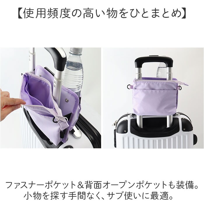 | 商品説明 | 【旅行のお供に!頼れる相棒】飲み物や小物をすっきりIN!使い方も選べる「キャリーケースドリンクホルダー」。【シーンに合わせて使い分け可能】キャリーケースのハンドルに通して♪ショルダーを取り付け、肩から掛けられる2WAY!(※)スナップボタン&サイドに伸縮ゴム付きで、ハンドルに通しやすい仕様です。【両手を自由に使えてストレスフリー】左側の伸縮ゴム付きホルダーに、ペットボトルを!手を塞がずに持ち歩けて、サッと水分補給◎【すぐに取り出したい小物を収納】右側のポケットには、スマホやメガネ、モバイルバッテリーを。取り出しやすいオープンタイプ。【使用頻度の高い物をひとまとめ】ファスナーポケット&背面オープンポケットも装備。小物を探す手間なく、サブ使いに最適。【気分も上がる可愛いデザイン】キュートな刺繍入りでちょっとしたアクセントに♪お気に入りのアイテムで楽しくお出かけ! |