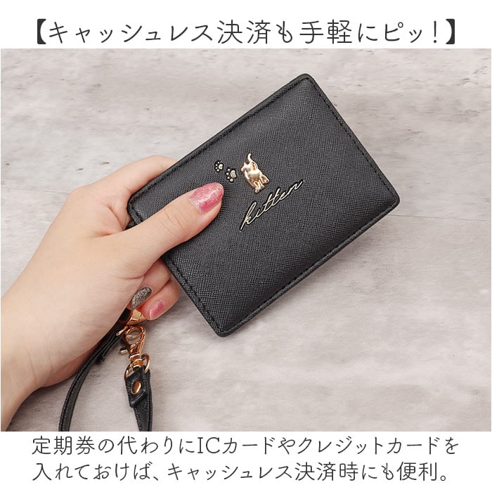 | 商品説明 | 【毎日のお出掛けをニャンコが応援】バラエティに富んだネコのモチーフがキラリと輝くアクセント♪「猫のパスケース」が新登場!【シンプルな窓付きポケット】パスケース前面には、交通系ICカードや定期券を見やすく収納できるクリア窓付きポケットを配置。【ぐーんと伸ばしてタッチ&スルー♪】軽くてコンパクトなリールは最長約33cmまで伸長。駅の改札やバス乗車時もワンタッチでらくらく!【キャッシュレス決済も手軽にピッ!】定期券の代わりにICカードやクレジットカードを入れておけば、キャッシュレス決済時にも便利。【バッグの中で迷子にならない工夫】ナスカン付きストラップでカバンのハンドルに取り付けられるので、スムーズな取り出しが可能。【指で押してサッと交換】クリアポケットにはカードを指で押してサッと取り出せる小窓付き。定期の更新時も手間取らない♪【パスケース単体でもOK!】リール付きストラップを本体Dカンから取り外して、パスケース単体としての使用もOK!【汚れや水滴はサッとひと拭き】ケース生地は汚れや水滴に強いフェイクレザー素材。清潔な布でサッとひと拭きすれば簡単キレイ。【お気に入りのニャンコをチョイス】リボンや足あと・・・個性的なモチーフでオメカシした猫たちが大集合!お気に入りはどのコ!? |