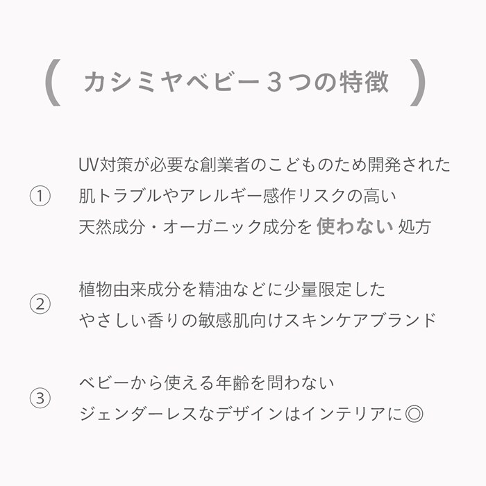 | 商品説明 | ベビーから大人まで使える、敏感肌向けの泡ボディソープ。創業者がこどもの肌を想い開発した、低刺激処方の泡ボディソープ。デリケートな肌を考え、やさしく洗い上げる成分を厳選。乳幼児から大人まで心地よく使える。ハンドソープとしても使用でき、泡を直接手に取って洗えるので、摩擦による肌への負担を軽減。カシミヤベビーは、シンプルでやさしい処方のスキンケアブランド。余計な成分を使わず、こどもの肌に寄り添うスキンケアを提供。精油をブレンドした、やさしい香り。ベルガモット・ゼラニウム・マンダリンオレンジを配合し、心地よい香りに仕上げました。特にこんな方におすすめベビー(生後3ヶ月以降の日焼け止め推奨)キッズ(未就学児~12歳くらいまで)デリケートな肌の方(全年齢)紫外線が気になる方(全年齢) |
