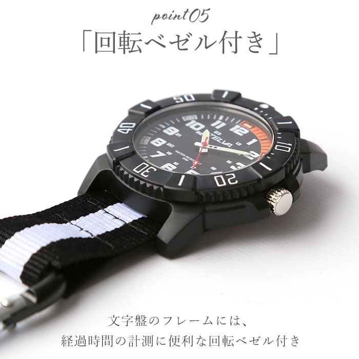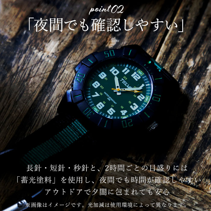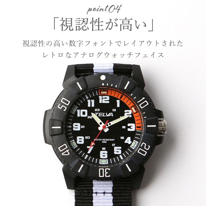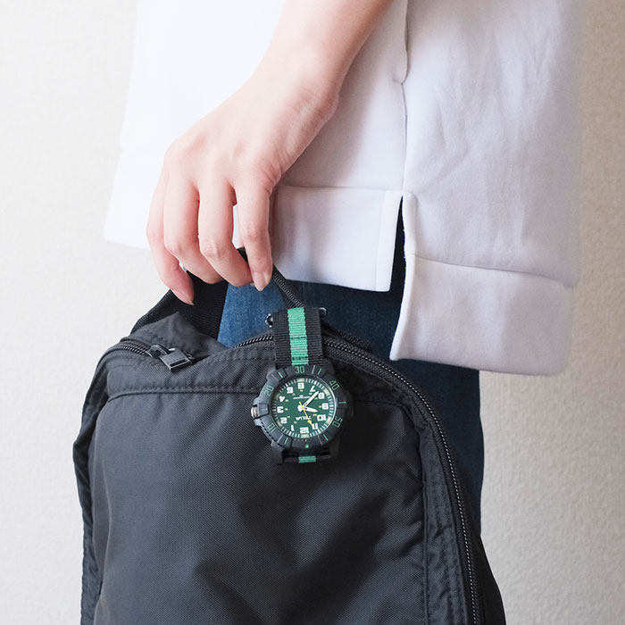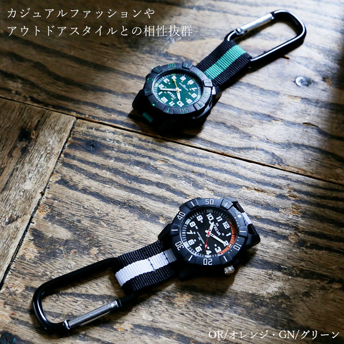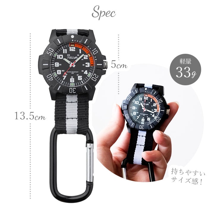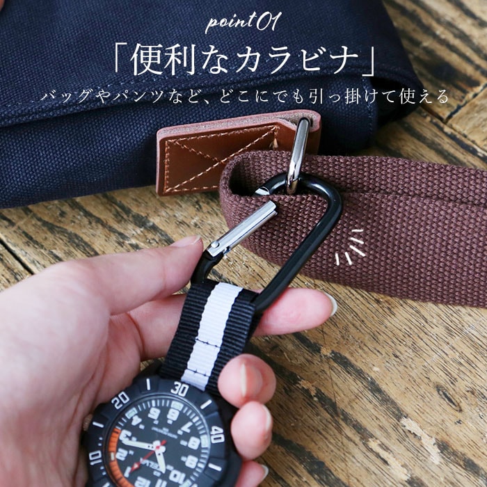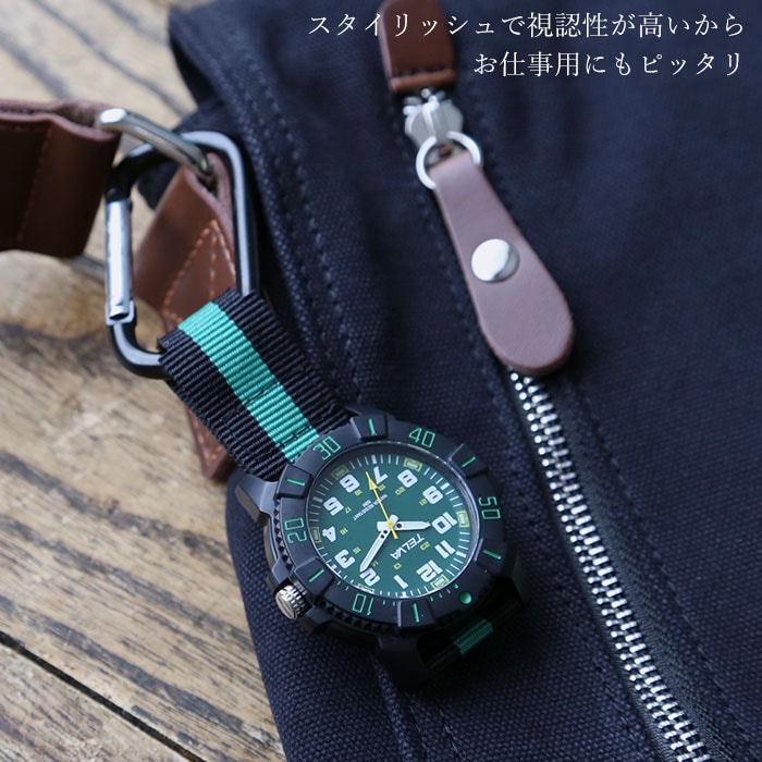 | 商品説明 | カラフルなベルトとインパクトのある文字盤がスタイリッシュ!「TELVA-テルバ- アナログハンギングウォッチ」が新登場。ベルトに付いたカラビナフックで、パンツのベルト通しやリュックのループなどに引っ掛けて使えるワイルドなハンギングウォッチ。アウトドアでも時間が読みやすい、視認性の高い数字フォント(字体)でレイアウトされた、レトロなアナログウォッチフェイス。長針・短針・秒針と、2時間ごとの目盛りには蓄光塗料が使用。夜間でも時間が確認しやすく、アウトドアで夕闇に包まれても安心。文字盤のフレームには、経過時間の計測に便利な回転ベゼル付き。水周りでのお仕事や手洗いのとき、屋外で突然雨に降られても安心して使うことのできる日常生活用防水機能付き(5気圧防水)。(※完全防水仕様ではありません。)ユニークなハンギングスタイルなので、医療現場で働く方や腕時計をつけられないお仕事の方、腕時計の金属部分が肌に直接触れるのが心配・・・という敏感肌の方にもピッタリ。シンプルなカラーリングとスポーティなルックスが、カジュアルファッションやアウトドアスタイルとの相性抜群。 |