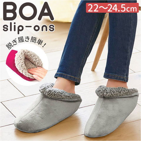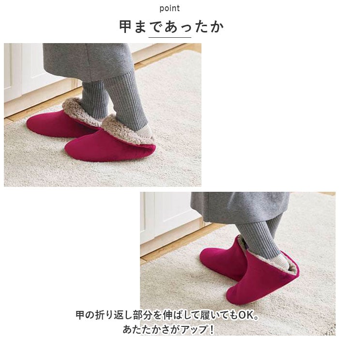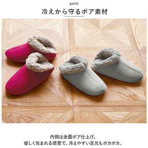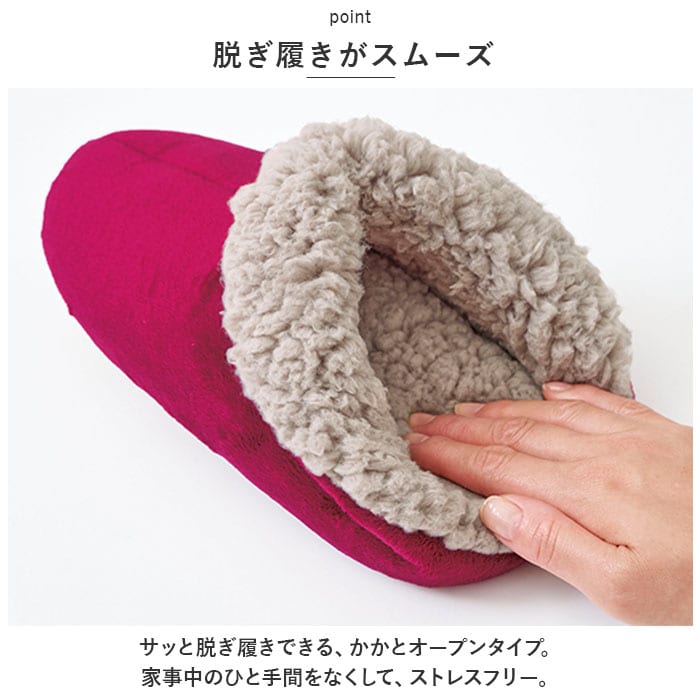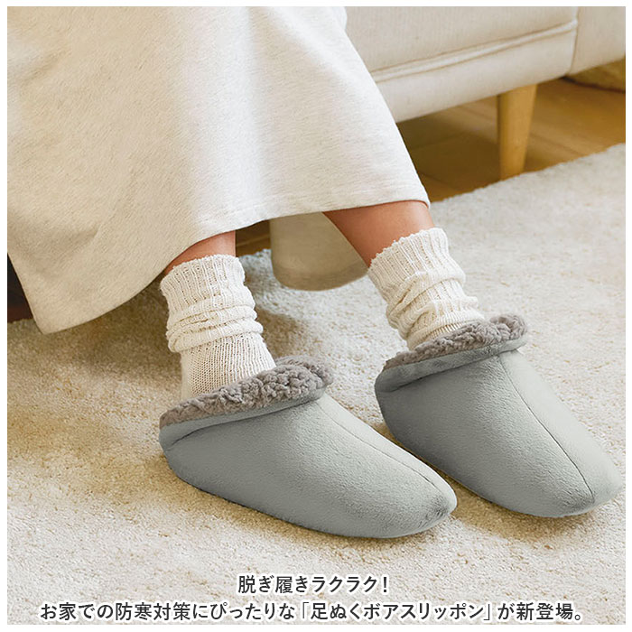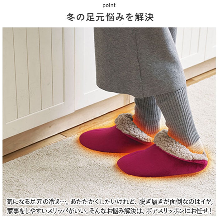| 商品説明 | 脱ぎ履きラクラク!お家での防寒対策にぴったりな「足ぬくボアスリッポン」が新登場。【冬の足元悩みを解決】気になる足元の冷え…。あたたかくしたいけれど、脱ぎ履きが面倒なのはイヤ。家事をしやすいスリッパがいい。そんなお悩み解決は、ボアスリッポンにお任せ!【冷えから守るボア素材】内側は全面ボア仕上げ。優しく包まれる感覚で、冷えやすい足元もポカポカ。【脱ぎ履きがスムーズ】サッと脱ぎ履きできる、かかとオープンタイプ。家事中のひと手間をなくして、ストレスフリー。【ソフトで滑りにくいソール】底面はソフトな質感でフローリングを傷つけにくく、歩いた時のパタパタ音も軽減。かかと部分には滑り止め付きで、室内での安全面にも配慮。【甲まであったか】甲の折り返し部分を伸ばして履いてもOK。あたたかさがアップ!【お手入れがラクラク】汚れが気になったら、自宅で手洗いOK。いつも清潔をキープ。【お家時間を快適に】もこもこボアの大人可愛いアイテム。リラックスタイムも家事の時間も、より楽しく快適になるようサポート。 |