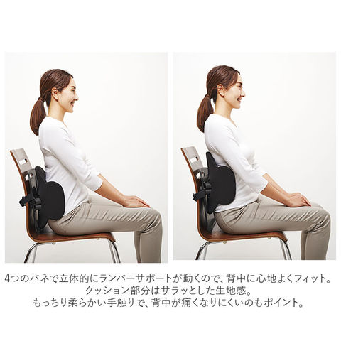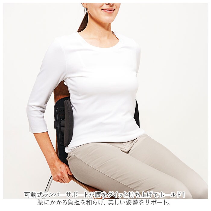 | 商品説明 | いつも使っているイスに簡単取り付け♪姿勢を整える「ボディカルテ腰楽座サポートプレート」が新登場。可動式ランバーサポートが腰をグイッと持ち上げてホールド!腰にかかる負担を和らげ、美しい姿勢をサポート。・4つのバネで立体的にランバーサポートが動くので、背中に心地よくフィット。クッション部分はサラッとした生地感。もっちり柔らかい手触りで、背中が痛くなりにくいのもポイント。体重を加えることで体のサイドにまわり込んで引き寄せる、サイドサポートも搭載。プレート裏面に位置調節穴付き。ご自身の体型や支えたい部位によって、左右3段階・上下5段階に調節可能!(※左右約2.5cm、上下約7cm幅に可動します。)プレートの位置を調節し、バックルベルトでイスにカチッと装着!伸縮性のあるベルトで長さ調節もラクラク。ご自宅のリビングやオフィスで大活躍。 |