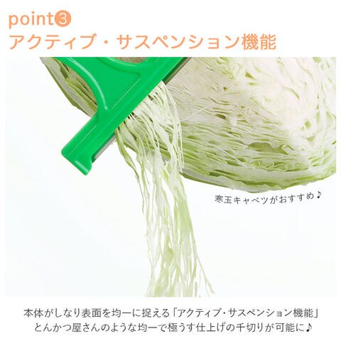 | 商品説明 | キャベツを撫でるように削るだけで、ふわっふわっの千切りキャベツが出来る!新発想ピーラー「キャベツピーラーSuperLight(スーパーライト)」キャベツの千切りをまじめに極めて導き出した“3つの秘密”で、スーパーふわっふわっ食感の千切りがラクラク出来る♪【秘密1】1本1本丹念に磨き上げ、本格刃付けのされた新型切り込み刃を採用。切れ味にこだわった鋭い高精密ギザ刃で、キャベツの繊維をサクサクとスライス!【秘密2】新発想!握らないグリップ。中央のリングに指をかけて、かる~く引くだけで、力を入れずにスムーズにスライスが出来る「指かけリング方式」採用。【秘密3】柔軟性の高い素材と独自の設計で、本体がしなり、食材の表面を均一に捉える「アクティブサスペンション機能」を実現。とんかつ屋さんのような均一で極うす仕上げの千切りが可能に♪なみなみのオリジナル刃なので、削ったキャベツの飛び散りを抑えてより軽い引き心地。ピーラー本体は、約22gと超軽量!指一本で簡単に引けて、手の力が弱いご年配の方でも安心して使える。水ですすぐだけでお手入れも簡単!毎日家事で忙しいママも楽ちん。きゅうりやにんじんのスライス、大根の桂剥きなど、ピーラーとしての従来の皮むきもラクラク均一に仕上がる。キャベツピーラーラクうまレシピをまとめた便利なミニブックレット付き。 |