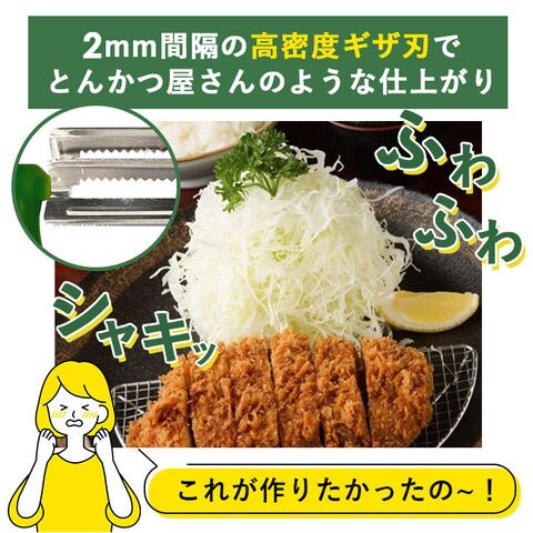 | 商品説明 | これまでの2倍(メーカー比)のスピードで千切りキャベツができる「キャベピィMAX」が登場!手早く大量の千切りキャベツがつくれる秘密は特許取得の2枚刃。1枚刃の従来品に比べ、2倍のスピード(メーカー比)で手早く千切りキャベツをつくることができる!使い方は簡単!半分に切ったキャベツを上から下へ大きく削る。軽くなでるようにするのがポイント。とんかつ屋さんのようにふわふわシャキシャキ食感の千切りキャベツをご家庭でも楽しんでもらえるよう、刃先のカタチや間隔(ピッチ)にもこだわった一品。刃先に2mm間隔で並んだ鋭い高密度ギザ刃がキャベツの繊維をサクサクと切り刻み、ふわふわでシャキシャキな千切りキャベツが簡単につくれる!ご家族が多い方、お料理好きの方、また飲食店など、大量の千切りキャベツが必要な方々におススメの商品。 |