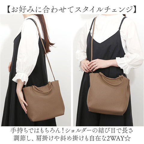 | 商品説明 | 【お出かけの相棒にぴったり】サッと持ち出せて、色んなシーンで活躍◎「ソフトフェイクレザー2WAYトートバッグ」。【落ち着きがあり上品な印象を演出】シボ感のあるフェイクレザー素材に、華奢なハンドル。キレイめコーデにも素敵にマッチ◎【お好みに合わせてスタイルチェンジ】手持ちではもちろん!ショルダーの結び目で長さ調節し、肩掛けや斜め掛けも自在な2WAY☆【マグネットでワンタッチオープン】力いらずで簡単◎ガバっと開いて出し入れしやすく、閉じれば中身のこぼれ落ちもガード。【見た目以上に頼りになる収納力】A5や500mlペットボトル、コスメーポーチなどがすっぽり。マストアイテムがひとまとめ◎【サクッと取り出せて迷子知らず】内側に4つのポケットを配置。バッグの中で小物を探す手間が不要。【お気に入りを選べるカラー】ベーシックやアクセントになるカラーをラインナップ。1つ持っていれば、季節問わずヘビロテ♪【ポケット仕様】内側:ファスナー式メッシュポケット×1、メッシュポケット×1、オープンポケット×2 |