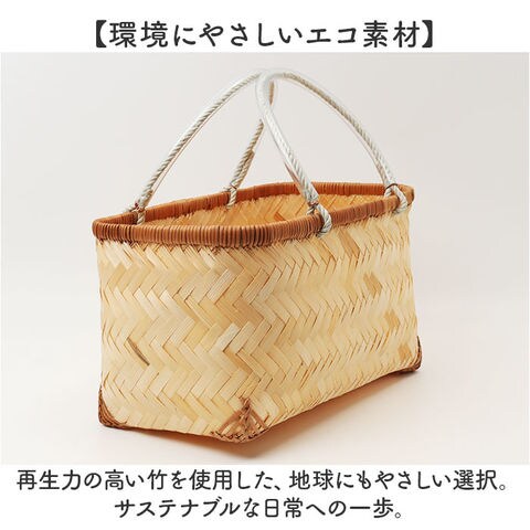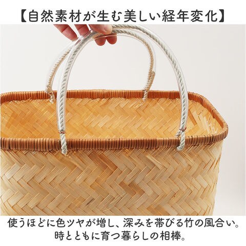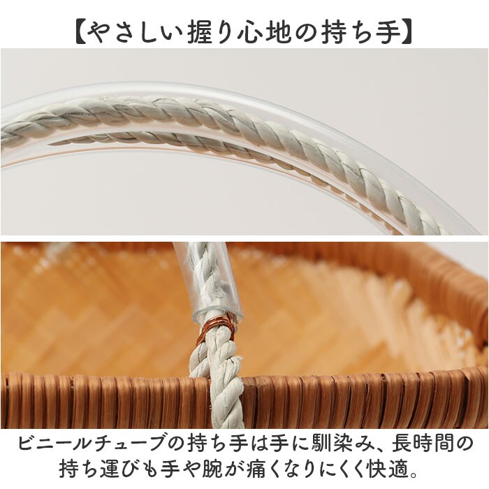 | 商品説明 | 【使うほどに愛着が増す竹のかご】ナチュラルな温もりと使いやすさを兼ね備えたミニサイズの「市場かご」が登場。【お買い物にも収納にも大活躍】スーパーでのお買い物はもちろん、リビングやキッチンでの収納にも映える万能かご。【通気性のよさで野菜も長持ち】竹ひごの通気性が野菜の鮮度をキープ!ナチュラルな暮らしに寄り添う保存アイテム。【軽くて丈夫、使い勝手のよさが◎】底面に力竹の補強入り。しなやかで弾力ある竹が食材を守り、マチ広でたっぷり入る安心の収納力【やさしい握り心地の持ち手】ビニールチューブの持ち手は手に馴染み、長時間の持ち運びも手や腕が痛くなりにくく快適。【ひとつひとつ職人の手仕事】熟練の技で丁寧に編み上げられたかご。竹の表情を生かした唯一無二の存在感。【自然素材が生む美しい経年変化】使うほどに色ツヤが増し、深みを帯びる竹の風合い。時とともに育つ暮らしの相棒。【環境にやさしいエコ素材】再生力の高い竹を使用した、地球にもやさしい選択。サステナブルな日常への一歩。 |