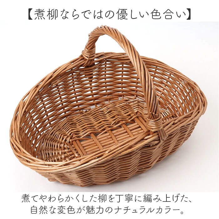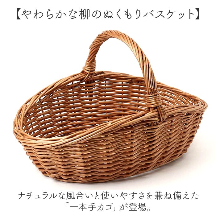 | 商品説明 | 【やわらかな柳のぬくもりバスケット】ナチュラルな風合いと使いやすさを兼ね備えた「一本手カゴ」が登場。【煮柳ならではの優しい色合い】煮てやわらかくした柳を丁寧に編み上げた、自然な変色が魅力のナチュラルカラー。【ざっくり編みが生む温かみ】しっかりとした丈夫な柳素材をざっくりと編み込んだ、素朴でやさしい風合い。【持ち運びやすいワンハンドル仕様】一本手のすっきりデザインで、軽くて持ちやすい!高い所に置いても出し入れ簡単。【暮らしになじむインテリア性】お菓子や小物を入れて、リビングやキッチンに置くだけで絵になるナチュラルバスケット。【自然素材ならではの風合い】時とともに深まる色合いと艶。天然素材だからこそ味わえる経年変化の美しさも魅力。 |