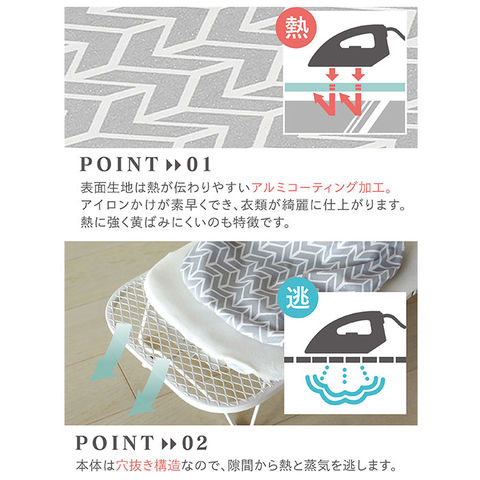| 注意点 | 本体カバー・クッション材は洗えません。本体カバーに汚れが付いた場合は、固く絞った綺麗な布で拭いて下さい。本商品は折り畳み式のため、中心の折れ部に必要以上の負荷が掛かると凹む恐れがあります。絶対に耐荷重(3kg)以上の力を加えないで下さい。フック掛けで収納する際は、コートなどの重い物を掛けたまま収納しないで下さい。手をついたり乗ったりしないで下さい。アイロンの電源を入れたままアイロン台の上に放置すると、焦げたり発火する恐れがありますので、絶対にお止め下さい。ご使用前に本体の破損やガタつきなどを点検し、安全を確認してからご使用下さい。アルミコーティングされたアイロン台の表面はアイロン熱をよく反射するので、衣類は上と下から加熱されプレスの効果を一段と高めます。従ってアイロンの指示温度は必ず一段下げてご使用下さい。サーモスタット(自動温度調節器)の効かないアイロンを使用されますと、衣類だけでなくアイロン台を焦がす危険もありますのでご注意下さい。脚を開くときは、脚が完全に止まるまで開いて下さい。脚が折れて事故につながる場合があります。脚を折り畳むときは、指などをはさまないようご注意下さい。アイロン台の下に足や物を入れて使用しないで下さい。裏からスチームが出るため火傷の恐れがあります。アイロンかけをするときはボード面の同じ場所を長時間使用しないで下さい。スプレーのりを使用するときは、容器の指示通り乾いた物にドライアイロンでご使用下さい。ご使用後は熱をもっていますので、冷めてから収納して下さい。フローリングの床などの上で使用すると傷が付く恐れがありますのでご注意下さい。火のそばに置かないで下さい。周りに人(特にお子様)やペットがいるときには、万が一の事故防止のため使用しないで下さい。アイロンかけ以外での用途に使用しないで下さい。アイロンは付属しません。カメラやモニターの性質により、画像と実物の色の違いがある場合がございますのでご理解願います。 |