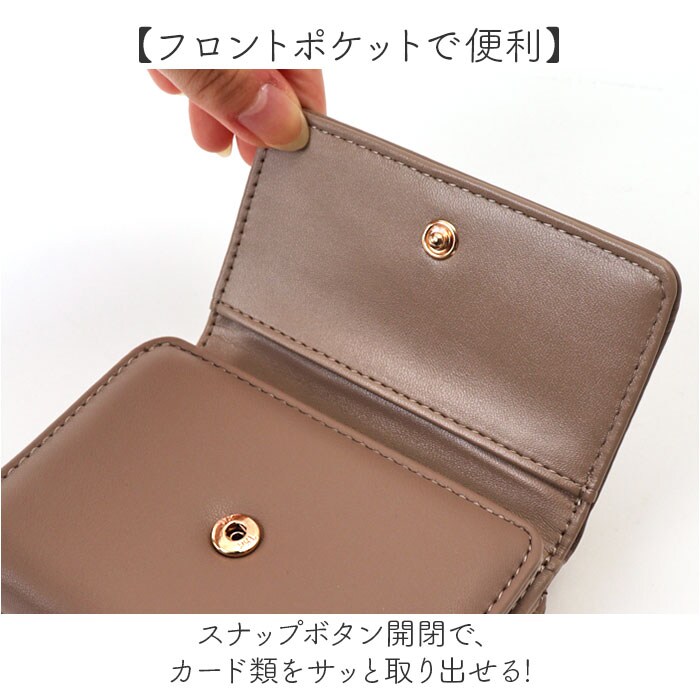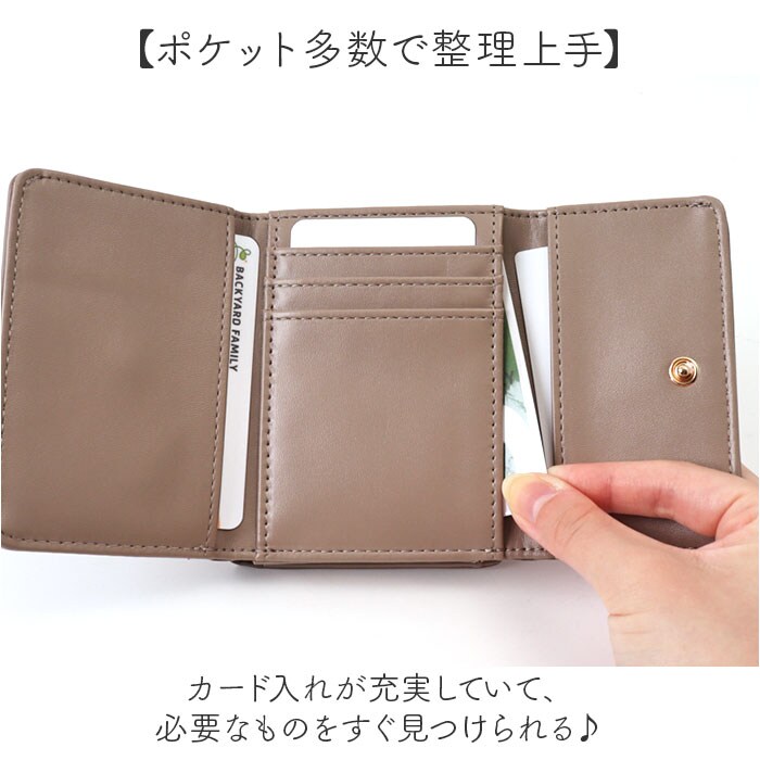| 商品説明 | 【小さくて可愛い三つ折り】使いやすさ抜群のミニ財布。【がま口で出し入れスムーズ】大きく開いて中身が見やすく、小銭の取り出しも楽々◎【フロントポケットで便利】スナップボタン開閉で、カード類をサッと取り出せる!【ポケット多数で整理上手】カード入れが充実していて、必要なものをすぐ見つけられる♪【手のひらサイズの三つ折り】コンパクト設計で小さなバッグにもすっぽり〇【合成皮革で上品な質感】カジュアルにもきれいめにも合わせやすい、洗練された素材感。 |