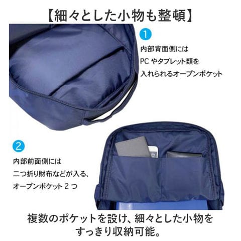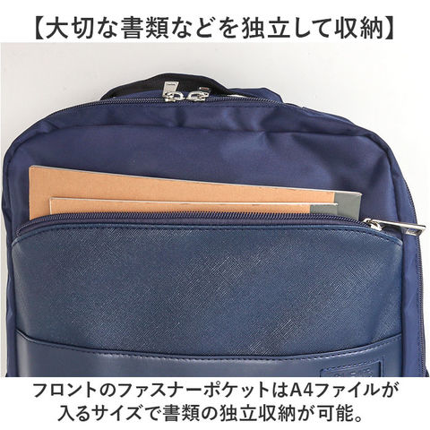 | 商品説明 | 【ツイルナイロンと合皮で高見え】高見えする異素材コンビで上品な見た目に♪普段のお出かけにもぴったりなビジネスリュック。【B4サイズ対応】クリアファイルはもちろん、大きな書類ケースも収納可能。たっぷり収納できるので通学用にも【大切な書類などを独立して収納】フロントのファスナーポケットはA4ファイルが入るサイズで書類の独立収納が可能。【たっぷり入るマチ幅】マチ幅を設け厚みのあるポーチなどもすっぽり入るのも嬉しいポイント。【PCやタブレットを入れるのに】背面の収納内にウレタン入りのポケットを搭載し、電子機器を安全に持ち運び可能。【大きなものも出し入れスムーズ】メイン収納はダブルファスナーで、大きな荷物も引っかからず出し入れがスムーズ。【細々とした小物も整頓】複数のポケットを設け、細々とした小物をすっきり収納可能。【ちょっとした持ち出しに便利】公共機関の移動やすぐに持ち出したい時に便利な上部ハンドル付き。【快適な背負い心地に】ショルダーと背面にメッシュ素材のクッションを配置。蒸れにくく快適な背負い心地に♪【高見え素材で高級感あり】程よい光沢感があるツイルナイロンと合皮素材を使用しラフ過ぎず高見えアイテム。【2つの質感の合皮】フロントの合皮も2つの異なる合皮素材を組み合わせデザインにもこだわりアリ☆【毎日気軽に使える】ナイロン素材を使用し、軽さはもちろん水に濡れても安心素材。毎日の通勤に使える!※(※)撥水・防水機能はございません。【ポケット仕様】メイン収納・・・PCポケット×1、オープンポケット×2フロント・・・ファスナーポケット×1両サイド・・・オープンポケット×1ずつ |
