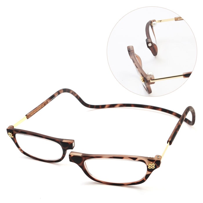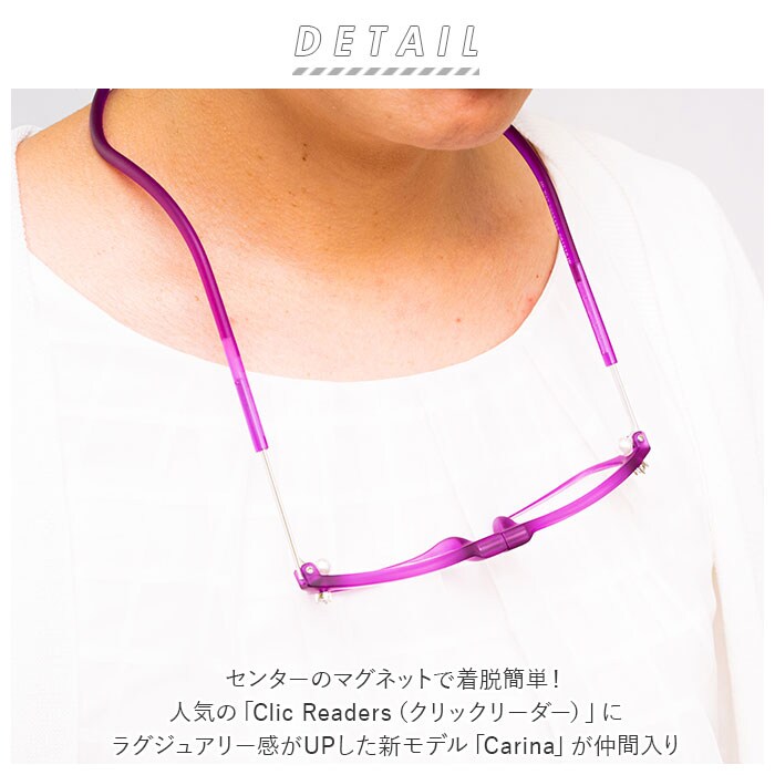 | 商品説明 | センターのマグネットで着脱簡単!人気の「Clic Readers(クリックリーダー)」にラグジュアリー感がUPした新モデル「Carina」が仲間入り。クリックリーダーとは、フロント部分のマグネットを取り外すことでメガネの掛け外しができる、お洒落で画期的なリーディンググラス。テンプル(耳に掛けるツル)部分が首の後ろで繋がった一体形状になっているため、外した後もアクセサリー感覚でそのまま首に掛けておけるのが特徴。置き忘れや紛失防止にも効果的。フレーム横部分には、約20ミリ程度伸長する便利なアジャスター付きなので、お顔のカタチにぴったりフィット。弾力性に優れ、ふんわり軽い掛け心地のナイロン素材を使用しているから耐久性も抜群。ピアスのような飾りパーツには、高級感のあるキュービックジルコニアとフェイクパールを使用。上品な輝きが目元に華やかさをプラス!ゴールドとシルバーの2種類のパーツを、その日のファッションに合わせて素敵にコーディネートできちゃう!度数は「+1.5」「+2.0」「+2.5」「+3.0」「+3.5」の選べる5タイプ。シャープなスクエアシェイプと鮮やかなカラーリングで、ネックレスのようにお洒落に身に着けられるのが嬉しいポイント♪持ち運びに便利な専用ソフトケース付。 |