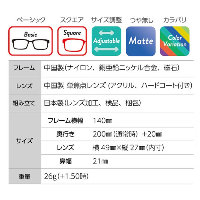 | 生産国 | [フレーム・単焦点レンズ(アクリル、ハードコート付き)]中国 ※ ※[組み立て]日本(レンズ加工、検品、梱包) |