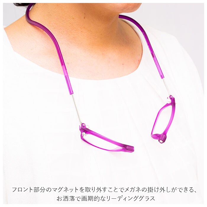 | 注意点 | ご使用上の注意の範囲外の予期せぬ不具合や有害事象が起こった場合には、直ちに使用を中止してください。万一、ご使用中に不快感や視力の異常を感じた時は、直ちに使用を中止し、医師などにご連絡、ご相談下さい。当商品は手元の細かい文字などを見る時に使用する老眼鏡です。太陽を見たり、メガネを着けたまま歩く、などは出来ません。当商品はフレームの中央部に磁石を使用しています。ペースメーカー、クレジットカード等の磁気カード類、ディスク・テープ及び精密機器等、磁気の影響を受ける物に近づけないで下さい。当商品はアクリル光学レンズを使用しています。素材の特性から、アルコール類を含むウェットタイプのメガネ拭きなどを使用しての消毒やふきとりは、レンズのカット面よりアルコール類などが浸透し、亀裂やワレが生じる場合がございますので、ご注意下さい。プラスチックレンズも強い衝撃があれば破損する可能性があります。また、フレームからレンズが外れる場合もあります。また、フレームからレンズがれる場合もありますのでご注意下さい。フレームが直接、頭・顔に触れる部分に関して肌の弱い方、アレルギー体質の方などはご使用の際、十分にご注意下さい。ツル(テンプル)の長さを調節する際、力を入れすぎて引っ張ると、可動部が抜けてしまう場合があります。また、誤って指を挟んだりしますと、ケガに繋がりますので、よく確かめて操作してください。レンズの入替、交換はレンズを取り外す際、フレーム塗装が剥離し、キズ・破損が生じる場合がありますので、お奨め致しません。フレームは弾力のある素材ですが、お持ち運びの際にカバン内に詰め込む、荷重がかかる、固い・尖った物にぶつかる、などで、フレームの変形・破損、レンズにキズ、外れる・割れる等の起こる可能性がありますので、収納・お持ち運びの際は、十分にご注意下さい。カメラやモニターの性質により、画像と実物の色の違いがある場合がございますのでご理解願います。 |