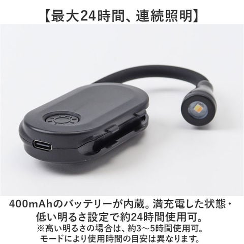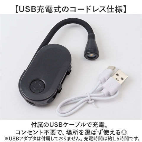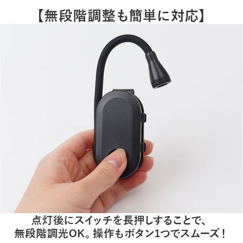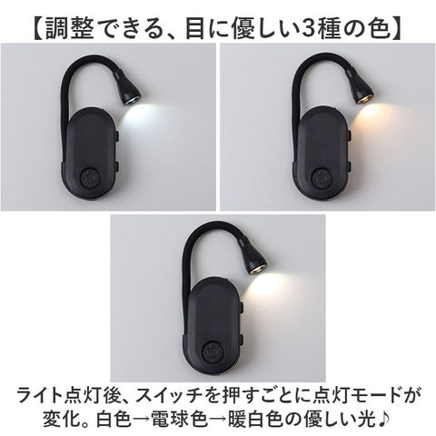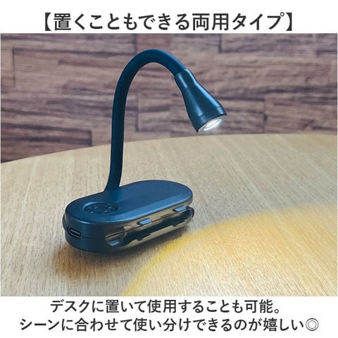 | 商品説明 | 【本に挟んで使える便利アイテム】読書や勉強、手芸などに最適◎手元を照らしてくれる「クリップオンブックライト」。【本体とクリップが一体化!】本や薄い生地に挟むことができるミニライト。アームが360度曲がり、お好みの角度に調節。【置くこともできる両用タイプ】デスクに置いて使用することも可能。シーンに合わせて使い分けできるのが嬉しい◎【調整できる、目に優しい3種の色】ライト点灯後、スイッチを押すごとに点灯モードが変化。白色→電球色→暖白色の優しい光♪【無段階調整も簡単に対応】点灯後にスイッチを長押しすることで、無段階調光OK。操作もボタン1つでスムーズ!【最大24時間、連続照明】・400mAhのバッテリーが内蔵。満充電した状態・低い明るさ設定で約24時間使用可。(※1)高い明るさの場合は、約3~5時間使用可。モードにより使用時間の目安は異なります。【USB充電式のコードレス仕様】付属のUSBケーブルで充電。コンセント不要で、場所を選ばず使えるのがポイント。(※2)USBアダプタは付属しておりません。充電時間は約1.5時間です。【どこへでも手軽に持ち運べて万能】ポケットやミニポーチに収まるコンパクト設計。旅行や出張などのお供にもおすすめ! |