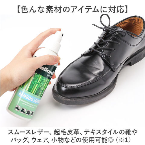 商品説明【汚れを落として優しくケア】天然成分90%!サッと使えるミスト式「Collonil オーガニックバンブーローション」【クリーニングと同時に乾燥から守る】天然のバンブーから抽出したエキスを配合。クリーニングに加え優れた保湿効果で潤いをプラス。【色んな素材のアイテムに対応】スムースレザー、起毛皮革、テキスタイルの靴やバッグ、ウェア、小物などの使用可能◎(※1)起毛皮革:スウェード、ヌバック、ベロア、ムートン。【使い方簡単!気になった時に】表面のホコリを落とし噴射口を水平に。約20cm離してスプレーするだけ。(※2)ローションのみの販売です。スムースレザーは布で軽く擦って汚れを落とし、乾いた後クロスで乾拭き。起毛皮革、テキスタイル素材は軽くブラッシングして汚れを落としてください。【室内でも安心のミストタイプ】環境に配慮した気化ポンプで噴射。どこでも手軽に安全に使えるのが嬉しい!【物を大切に使いたい方にぴったり】お気に入りのアイテムを長く使うために、日頃のケアは必須。贈り物にもおすすめ。