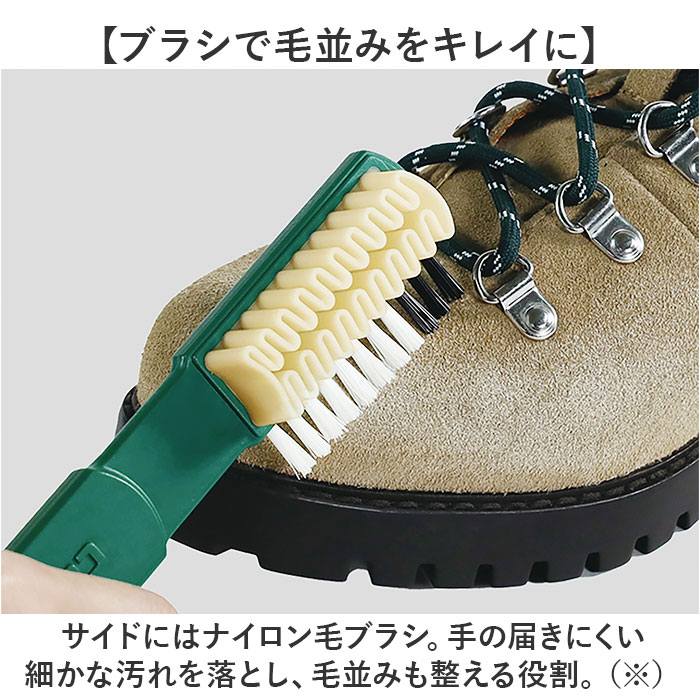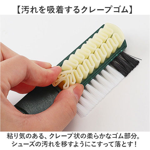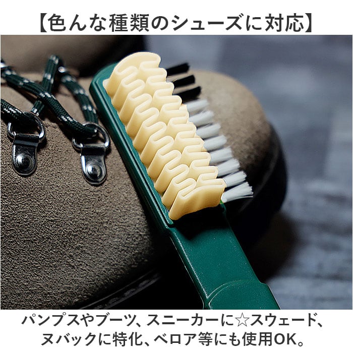 | 商品説明 | 【起毛皮革シューズのお手入れに】汚れを落として毛並みを整える!起毛皮革に特化した「Collonil クレープブラシ」。【汚れを吸着するクレープゴム】粘り気のある、クレープ状の柔らかなゴム部分。シューズの汚れを移すようにこすって落とす!【ブラシで毛並みをキレイに】サイドにはナイロン毛ブラシ。手の届きにくい細かな汚れを落とし、毛並みも整える役割。(※)毛の流れを整える際、濃い色の革は濃くなる方向に、薄い色の革は薄くなる方向にブラッシングしてください。【持ちやすく、吊るし収納も可能】凹凸があり、力を加えやすい太さのハンドル。フック穴を使って吊るせるから、収納もスマート◎【色んな種類のシューズに対応】パンプスやブーツ、スニーカーに☆スウェード、ヌバックに特化、ベロア等にも使用OK。【大切な靴を長く愛用したい方に】サッと手に取れて、お手入れしやすいアイテム。ギフトにも喜ばれそう♪ |