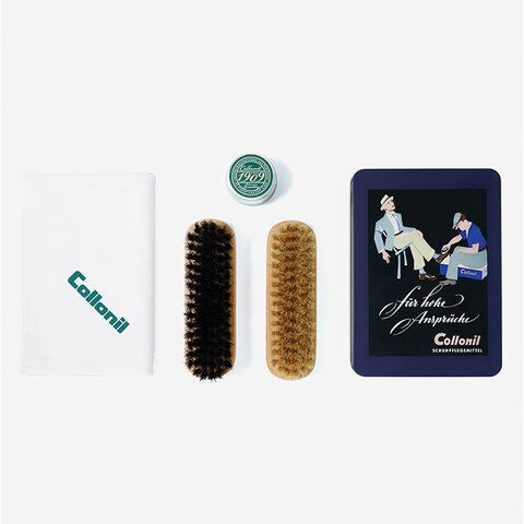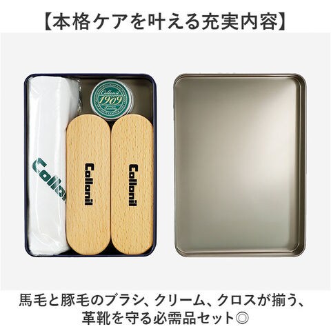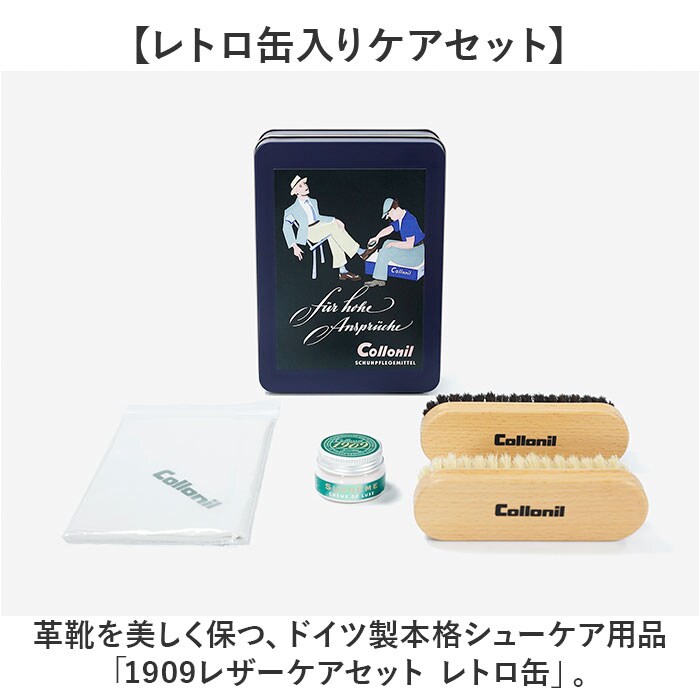 | 商品説明 | 【レトロ缶入りケアセット】革靴を美しく保つ、ドイツ製本格シューケア用品「1909レザーケアセット レトロ缶」。【本格ケアを叶える充実内容】馬毛と豚毛のブラシ、クリーム、クロスが揃う、革靴を守る必需品セット◎【2種のブラシで丁寧にケア】汚れを取る馬毛ブラシとクリームを塗りこむ豚毛ブラシで、仕上がりに差が出る♪【艶出し効果で美しく】シュプリームクリームデラックスが革に浸透し、上品な輝きを実現。【適度な厚みのクロス付き】コットン100%の四方クロスで、磨き上げも快適にできる〇【レトロ缶で保管もスマート】缶ケース付きだから、使わない時も素敵に収納! |