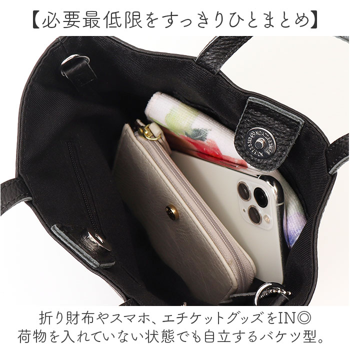 | 商品説明 | 【ミニマルスタイルにおすすめ】コンパクトで、おしゃれに持ち歩ける♪「シュリンクレザーバケツ型ミニ2wayトート」。【落ち着きがあり上品な印象に】シボ感を出したシュリンクレザーを採用。キレイめコーデにも素敵にマッチ。【お好みに合わせてスタイルチェンジ】手持ちOK!長さ調節可能なショルダーを取り付ければ、肩掛けや斜め掛けも自在な2way☆【マグネットでワンタッチオープン】力いらずで簡単◎ガバっと開いて出し入れしやすく、閉じれば中身のこぼれ落ちもガード。【必要最低限をすっきりひとまとめ】折り財布やスマホ、エチケットグッズをIN◎荷物を入れていない状態でも自立するバケツ型。【サクッと取り出せて迷子知らず】内側に2つのポケットを配置。バッグの中で小物を探す手間が不要。【流行に左右されず長く愛用☆】シンプルなデザインに、年代問わず使えるカラー。コーデにも馴染みやすい万能アイテム!【ポケット仕様】内側:ファスナーポケット×1、オープンポケット×1 |