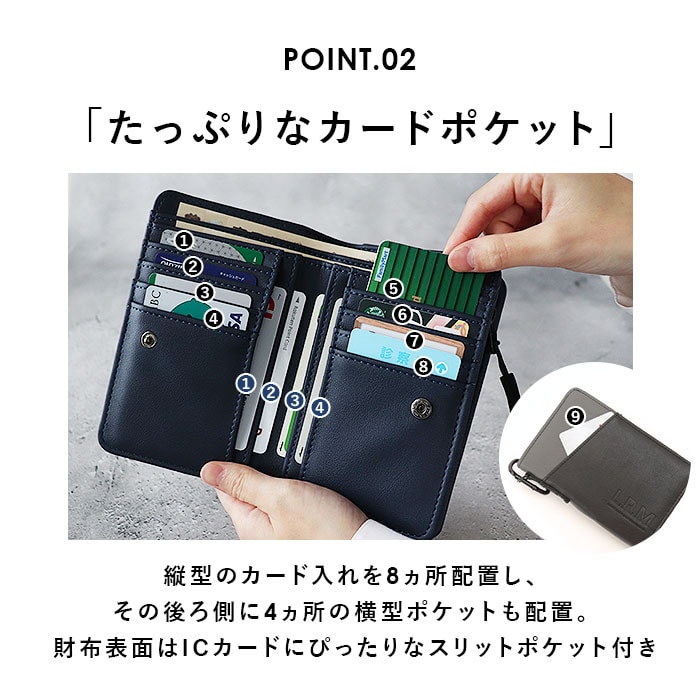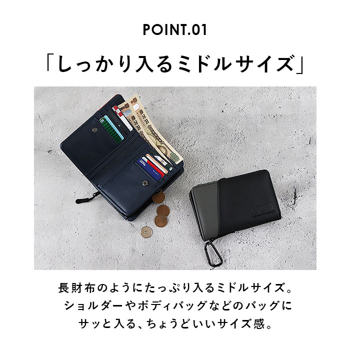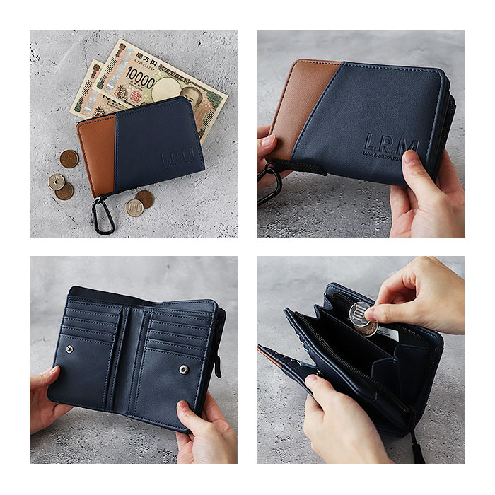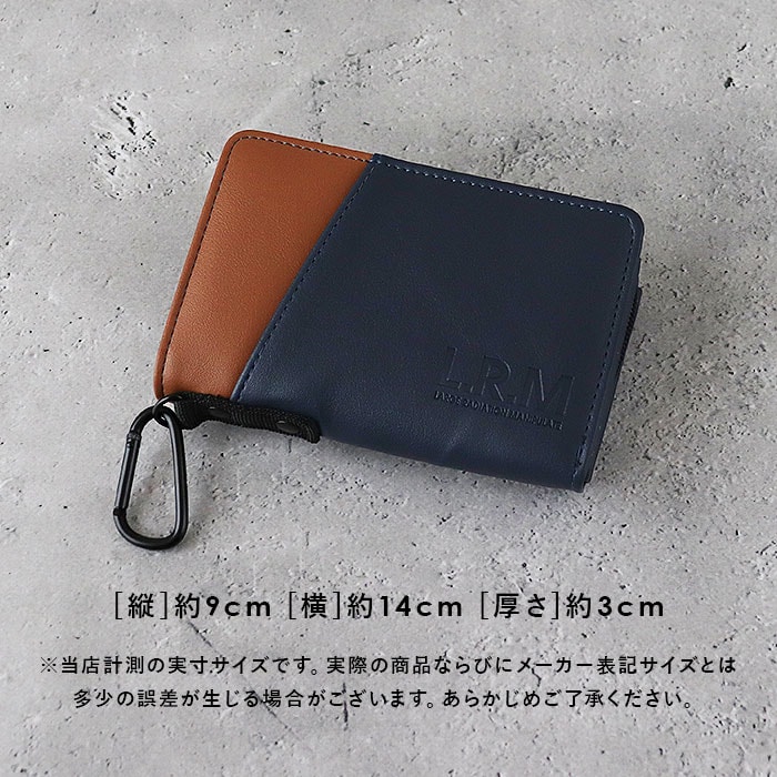 | 商品説明 | たっぷり入ってスリムに収納できる!L.R.M(エル・アール・エム)の切り替え合皮ミドル財布が発売。L.R.Mは「LARGE RADIATION MANIPULATE」の略。アクティブスタイルをもっと日常的に、かつ気軽に持てるアイテムに追及したスタイルを提案!遊び心のある、おしゃれなバイカラーデザインが魅力の二つ折り財布。滑らかな手触りの合皮素材を使用。ポケットを多く設け、小銭やカード類などがしっかり収納可能!収納スペース開口部は、開閉しやすいスナップボタン式。内側にお札入れ×2、縦型カードポケット×8、フリーポケット×4を配置。背面側のL字ファスナー式小銭入れは2スペース仕様。フリーポケット×2も装備!ファスナー引き手付きで、開閉がラクラク。フロントのスリットポケットに使用頻度の高いICカードなどを入れておけば、サッと取り出せて便利。カバンやボトムスのベルトループなどに取り付けできる、カラビナフック付き。フロントの型押しブランドロゴがポイント! |