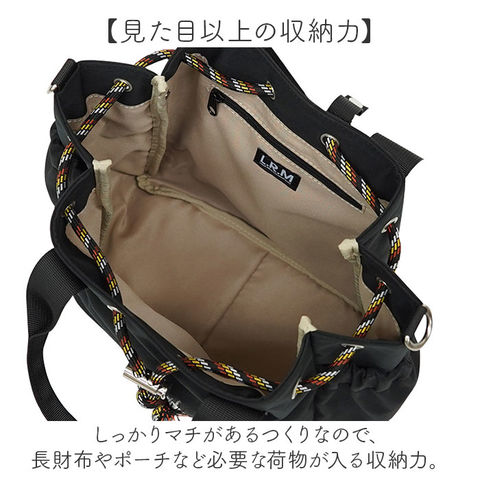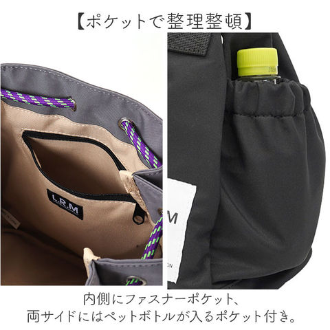 | 商品説明 | 【遊び心のあるデザイン】パラコードを合わせた他にはないスタイリッシュさ!巾着2WAY手提げショルダー。 【About L.R.M -エル・アール・エム-】L.R.Mは「LARGE RADIATION MANIPULATE」の略。アクティブスタイルをもっと気軽に持てるアイテムに昇華させたいという思いから生まれたアウトドアブランド!【持ち方自由】ショルダーベルトは取り外しが可能。手持ちや肩掛けどちらでも持てる2WAY仕様。【見た目以上の収納力】しっかりマチがあるつくりなので、長財布やポーチなど必要な荷物が入る収納力。【ポケットで整理整頓】内側にファスナーポケット、両サイドにはペットボトルが入るポケット付き。【出し入れラクラク】背面にはメインルーム直結のファスナー付きで、すぐに荷物が取り出せるのがポイント。【カラーで異なる素材】シルバーは上品な合皮素材、ブラックとグレーは軽くてタフなポリエステル素材を使用。 |