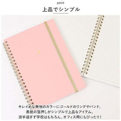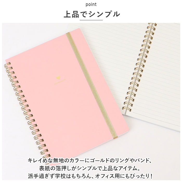 | 商品説明 | 大人女子にもおススメ♪上品で可愛いA5ノートが新発売♪【上品でシンプル】キレイめな無地のカラーにゴールドのリングやバンド、表紙の箔押しがシンプルで上品なアイテム。派手過ぎず学校はもちろん、オフィス用にもぴったり!【A5サイズ】カバンに忍ばせやすいA5サイズのノート!日常使いはもちろん、オフィスや学校でのサブノートやデイリー帳として使うのもおススメ♪【7mm横罫】書き込みがしやすいオーソドックスな7mm横罫を採用。メモや授業の下記まとめも整理して綺麗なレイアウトに書き込みが可能◎【留めバンド付き】カバンの中で開閉しない留めバンド付き。 |
