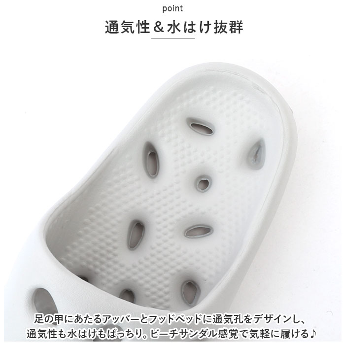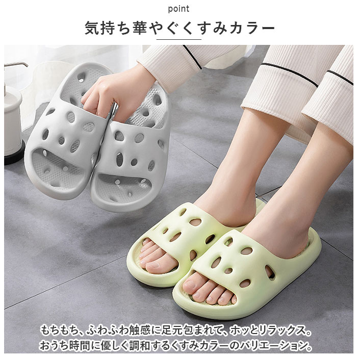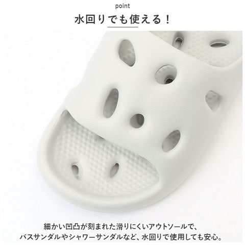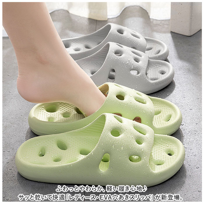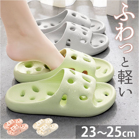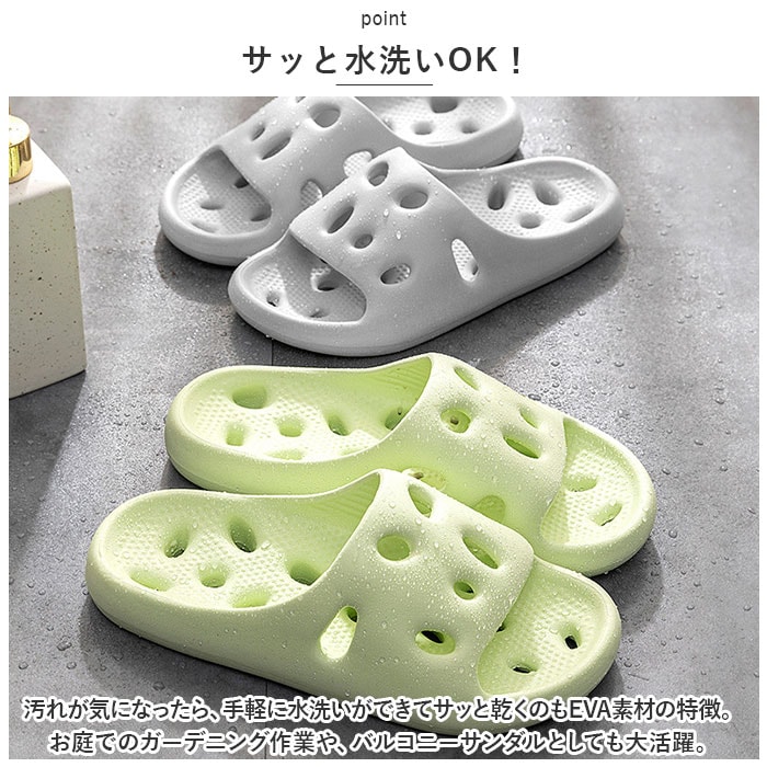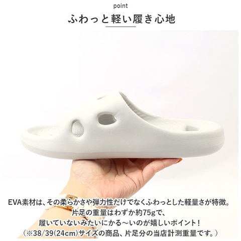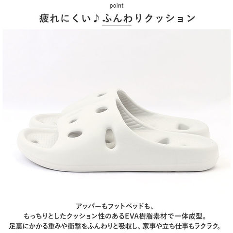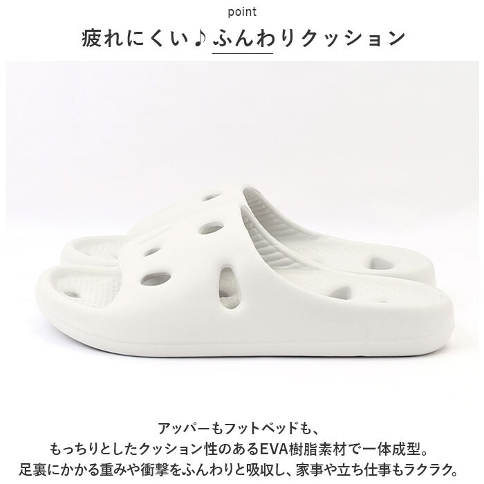 | 商品説明 | ふわっとやわらか、軽い履き心地♪サッと乾いて快適「レディース・EVA穴あきスリッパ」が新登場。【疲れにくい♪ふんわりクッション】アッパーもフットベッドも、もっちりとしたクッション性のあるEVA樹脂素材で一体成型。足裏にかかる重みや衝撃をふんわりと吸収し、家事や立ち仕事もラクラク。【ふわっと軽い履き心地】EVA素材は、その柔らかさや弾力性だけでなくふわっとした軽量さが特徴。片足の重量はわずか約75gで、履いていないみたいにかる~いのが嬉しいポイント!(※38/39(24cm)サイズの商品、片足分の当店計測重量です。)【通気性&水はけ抜群】足の甲にあたるアッパーとフッドベッドに通気孔をデザインし、通気性も水はけもばっちり。ビーチサンダル感覚で気軽に履ける♪【水回りでも使える!】細かい凹凸が刻まれた滑りにくいアウトソールで、バスサンダルやシャワーサンダルなど、水回りで使用しても安心。【サッと水洗いOK!】汚れが気になったら、手軽に水洗いができてサッと乾くのもEVA素材の特徴。お庭でのガーデニング作業や、バルコニーサンダルとしても大活躍。【気持ち華やぐくすみカラー】もちもち、ふわふわ触感に足元包まれて、ホッとリラックス。おうち時間に優しく調和するくすみカラーのバリエーション。 |