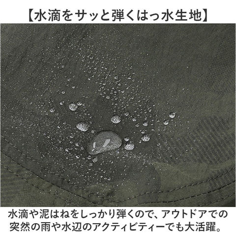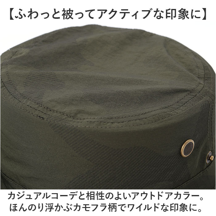 | 商品説明 | 【アウトドアだけじゃもったいない!】タウンユースにも映えるシンプルなシルエット♪「撥水CAMOポケッタブルアドベンチャーハット」【水滴をサッと弾くはっ水生地】水滴や泥はねをしっかり弾くので、アウトドアでの突然の雨や水辺のアクティビティーでも大活躍。【お出掛け時の日除け対策に】360度広がるツバが、真夏の気になる日射しを程よくカット。お肌のデリケートな女性に最適。【熱中症に負けない通気口付き】ハット両サイドにはスタイルのアクセントにもなる通気口を配置し、熱中症が気になる季節も安心。【スタイルの変化が楽しめる2WAY仕様】両サイドのスナップボタンを留めることで、テンガロンハット風にスタイルチェンジが可能。【風飛び防止ドローコード付き】ストッパー付きのあご紐を調整して首元にピタッと固定。風の強い日でもハットが飛んでいかない!【あご紐はセパレートしてもOK】タウンユースにラフにかぶりたい時には、あご紐両端のクリップを取り外してセパレートしても♪【フィット感を自在に調節可能】スベリ内側にアジャスターコードを内蔵しているので、ちょうどよいフィット感に調節が可能。※最小56.5cm~最大58.5cmまで、サイズ調節が可能なフリーサイズ。【いつでも清潔なかぶり心地】汗をかいたり汚れが気になる時には、手洗いで手軽にお手入れができるのも嬉しいポイント。【くるっと丸めて、ポケッタブル】柔らかく薄手の生地感に仕上げてあるため、カバンの片隅にくるっと丸めて持ち運びにも便利。【ふわっと被ってアクティブな印象に】カジュアルコーデと相性のよいアウトドアカラー。ほんのり浮かぶカモフラ柄でワイルドな印象に。 |