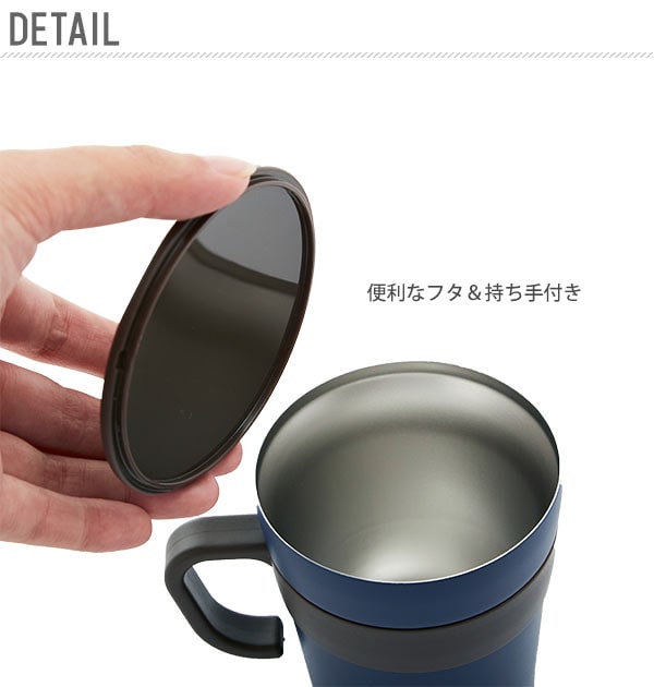 | 商品説明 | ステンレス真空二重構造の取っ手付きマグカップ。真空で飲み物の温度を保冷、保温。結露もしにくいのでデスクなどで扱いやすい。250mlのちょっとした飲み物にちょうどいいサイズ。簡単なふたもついています。 |
