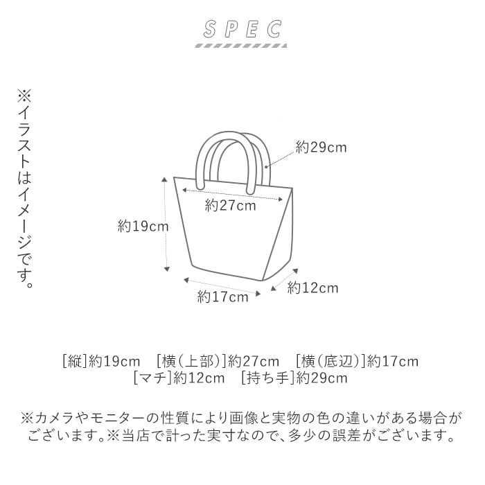 | サイズ | [縦]約19cm/[横(上部)]約27cm/[横(底辺)]約17cm [最大マチ(中央部分)]約12cm/[持ち手]約29cm ※マチのサイズは、ランチバッグの底面中央部での計測値です。側面にマチはありません。 ※サイズは当店計測の実寸サイズです。実際の商品ならびにメーカー表記サイズとは多少の誤差が生じる場合がございます。あらかじめご了承ください。 |