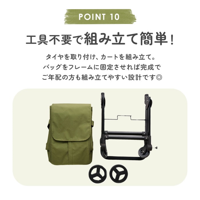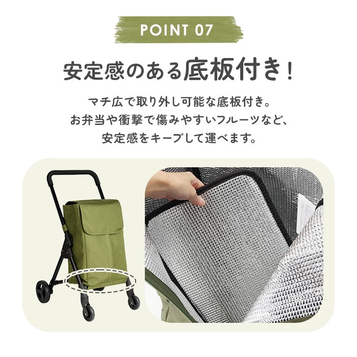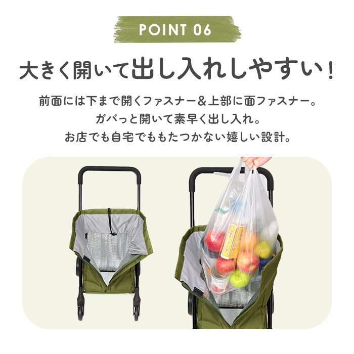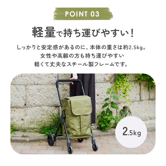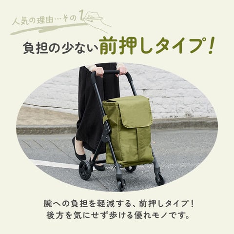 | 商品説明 | 【荷物をラクに運べる心強い味方】いつものお買い物が、グンと快適に☆デイリーに使える「cocoro 前押し4輪カート」。【より少ない負担で1度に運べる◎】腕への負担を軽減する前押しタイプ。後方を気にせず歩けて、週末のまとめ買いにもおすすめ。【女性でも持ち運びやすい軽量設計】本体の重さは約2.5kg。女性や高齢の方も持ち運びやすい軽くて丈夫なスチール製フレーム。【ドローコード&フラップのダブル】開口部はドローコードをキュッと絞るタイプ。フラップも付いており、こぼれ落ちをガード!【フロントファスナーで出し入れ簡単】前面には下まで開くファスナー&上部に面ファスナー。ガバっと開いて素早く出し入れ。【うれしい保冷・保温機能付き】内側は保冷・保温効果のあるアルミ蒸着フィルム仕様。開口部を閉めれば冷気などを逃さない♪【重い飲料やお米などたっぷり収納】約35Lの大容量サイズ!2Lペットボトルも数本収まり、食材もすっきりひとまとめ。【安定した状態で持ち運び可能】マチ広で取り外し可能な底板付き。お弁当や衝撃で傷みやすいフルーツなども安定感をキープ。【サッと取り出せる外側ポケット】背面に大きめのポケットを配置。すぐに取り出したい小物を入れておけて便利。【スムーズに軽がせてノンストレス】大きなタイヤ&360度回転するキャスターの4輪。耐荷重は10kgで、重たい荷物もOK!【スマートにお買い物できて便利】フレーム背面のフックでお店のショッピングカートに引っ掛け可能。置き場を気にせずお買い物♪(※1)カートの形状によっては取り付けできない場合があります。【工具不要でどなたでも簡単セット】タイヤを取り付け、カートを組み立て。バッグをフレームに固定させれば完成。(※2)バッグにフレーム固定ベルト付き。【使わない時の収納も省スペース】フレームは折りたたんでも自立し、スリムに収納。自宅での収納に困らないのもポイント。(※3)バッグを取り付けたままでも折りたたみ可能です。 |