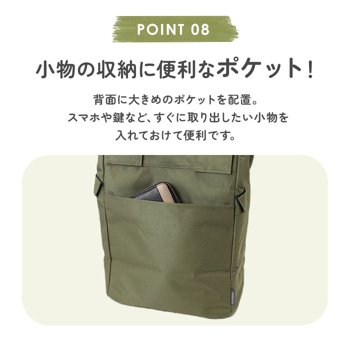 | 注意点 | 【使う人を選ばないシンプルデザイン】年代や性別問わず使いやすく、飽きのこないデザイン。家庭に1つあれば大活躍間違いなし◎【ポケット仕様】バッグ背面:オープンポケット×1年月の経過や空気中の湿度や紫外線、熱や汚れ等により、劣化などが生じる場合があります。長時間日光にあたったり、摩擦、水漏れなどによる色落ちや色移りすることがあります。お取り扱いの際は、商品やパッケージなどに記載されている品質表示、アテンションタグ、ご使用上の注意事項などを必ずご確認下さい。本来の目的以外にはご使用にならないで下さい。カメラやモニターの性質により、画像と実物の色の違いがある場合がございますのでご理解願います。 |