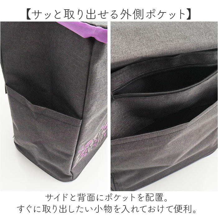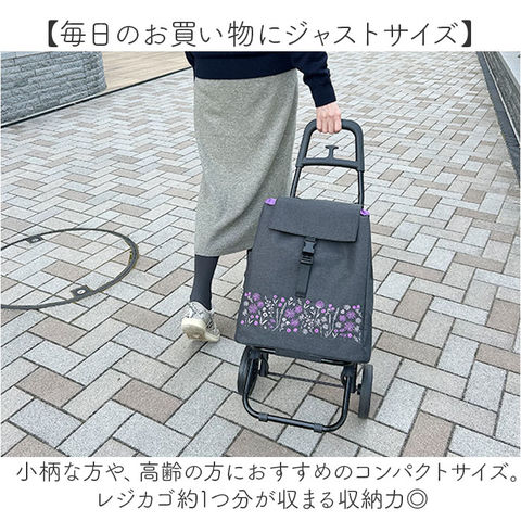 | 商品説明 | 【デイリーに使える心強い味方】小さくても機能的◎いつものお買い物がグンとラクになる、cocoro スモールネオカート。【ギフトにもぴったりな刺繍デザイン】濃淡のある色味を使った刺繍で、可憐なお花を再現。黒の背景に繊細な花柄が浮き立つ♪【雨の日でも安心の撥水性をプラス】シャンプレー生地を採用。撥水加工を施しているので、雨の日のお買い物にも。(※1)完全防水ではありません。【毎日のお買い物にジャストサイズ】小柄な方や、高齢の方におすすめのコンパクトサイズ。レジカゴ約1つ分が収まる収納力◎【紐&バックルフラップのダブル開口】バッグはフロントの紐でキュッと絞り、フラップを被せるつくり。こぼれ落ちをガード!【うれしい保冷・保温機能付き】内側は保冷・保温効果のあるアルミ蒸着フィルム仕様。開口部を閉めれば冷気などを逃さない♪【お弁当類や飲料も楽々持ち運び】マチ広で取り外し可能な底板付き。お弁当やペットボトルドリンクも収納できる、容量約25L。【サッと取り出せる外側ポケット】サイドと背面にポケットを配置。すぐに取り出したい小物を入れておけて便利。【コロコロ軽がせてノンストレス】大きなタイヤで安定感のある走行。耐荷重は約20kg、実際の約1/10の負荷で持ち運び◎【スマートにお買い物できて便利】フレーム背面のフックでお店のショッピングカートに引っ掛けOK。置き場を気にせずお買い物♪(※2)カートの形状によっては取り付けできない場合があります。【手荷物を掛けておけるフック付き】ハンドル部分にフックを装備。荷物が増えてしまった時もフックに掛ければ、両手が空いて快適。【工具不要でどなたでも簡単セット】フレームを組み立ててタイヤを取り付け。バッグを差し込んで、底面を固定させれば完成。(※3)タイヤの保護キャップを手で取り外せない場合は、お手持ちのペンチ等をご使用ください。【使わない時の収納も省スペース】フレームは折りたたんでスリムに収納。自宅での収納に困らないのもポイント。【ポケット仕様】サイド:オープンポケット×1背面:オープンポケット×1、ファスナーポケット×1 |